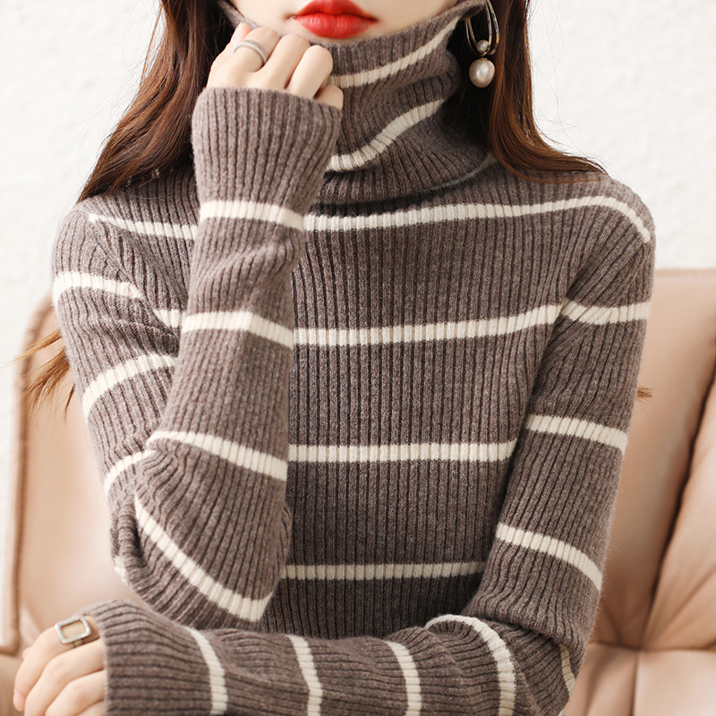 秋冬の新型高襟セーターの女性のスリムなストライプの中にガードルの積み重ね襟を掛けて長袖のウールのニットを打ちます。