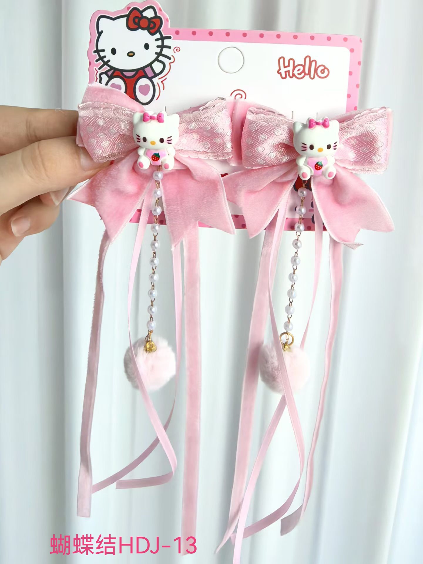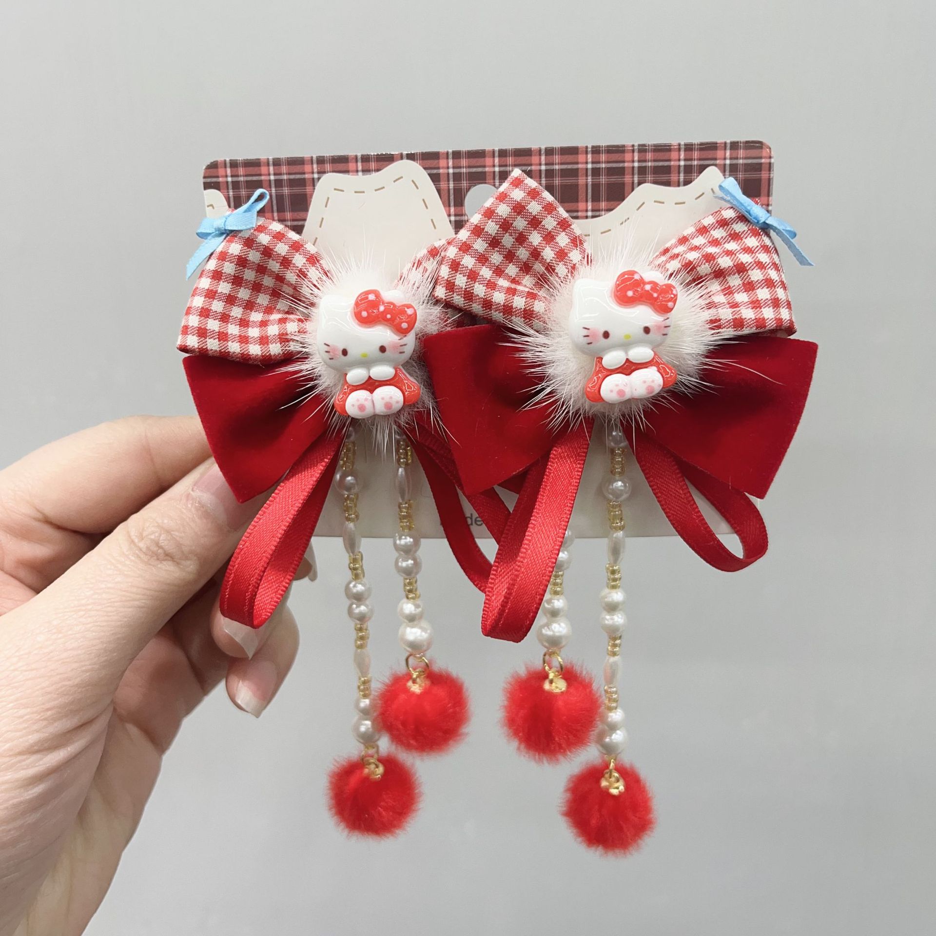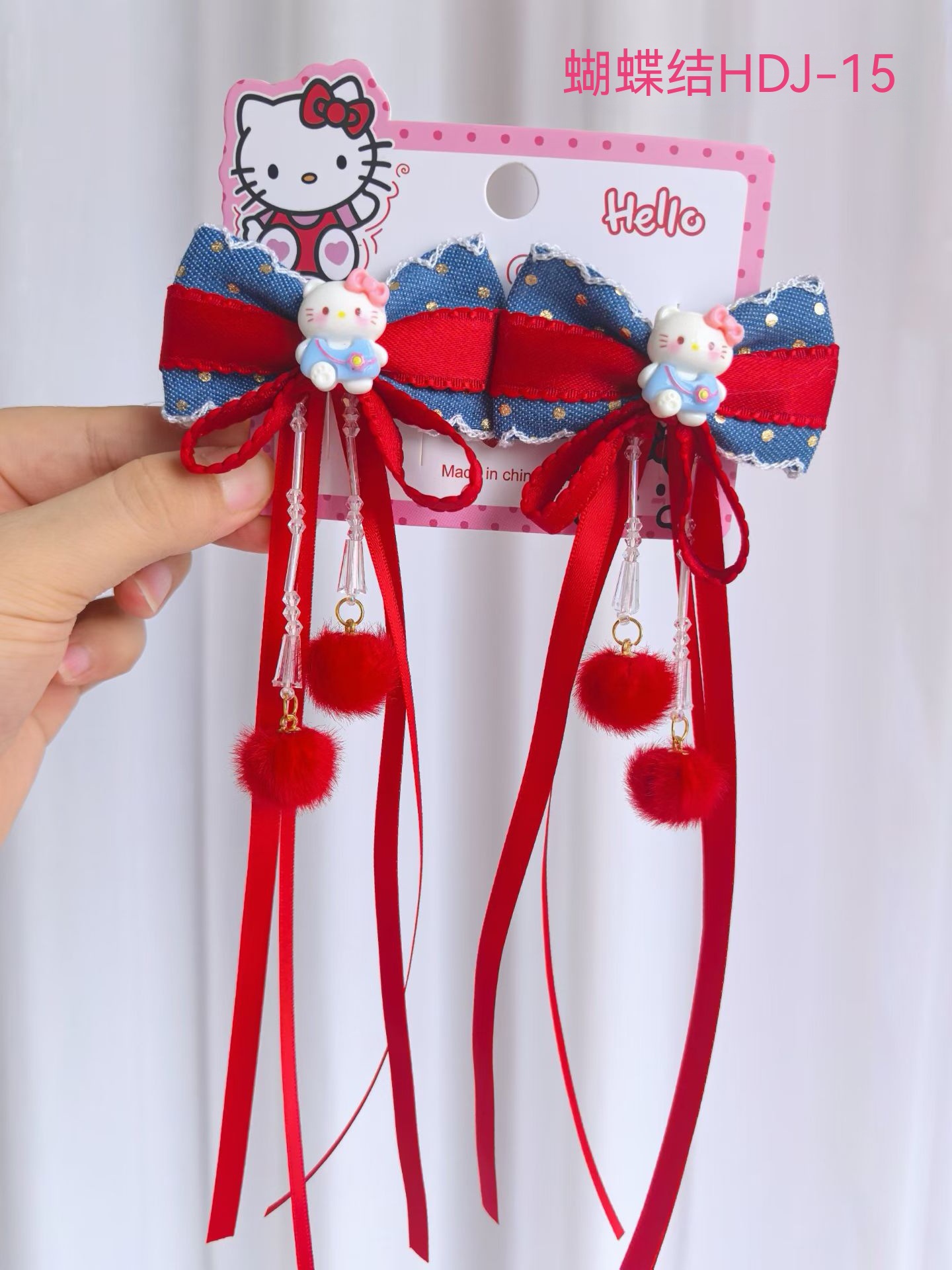 儿童新年红色HelloKitty发夹女童可爱蝴蝶结飘带对夹汉服古风头饰