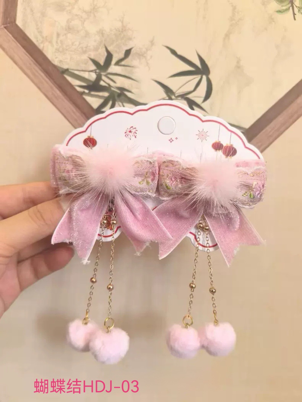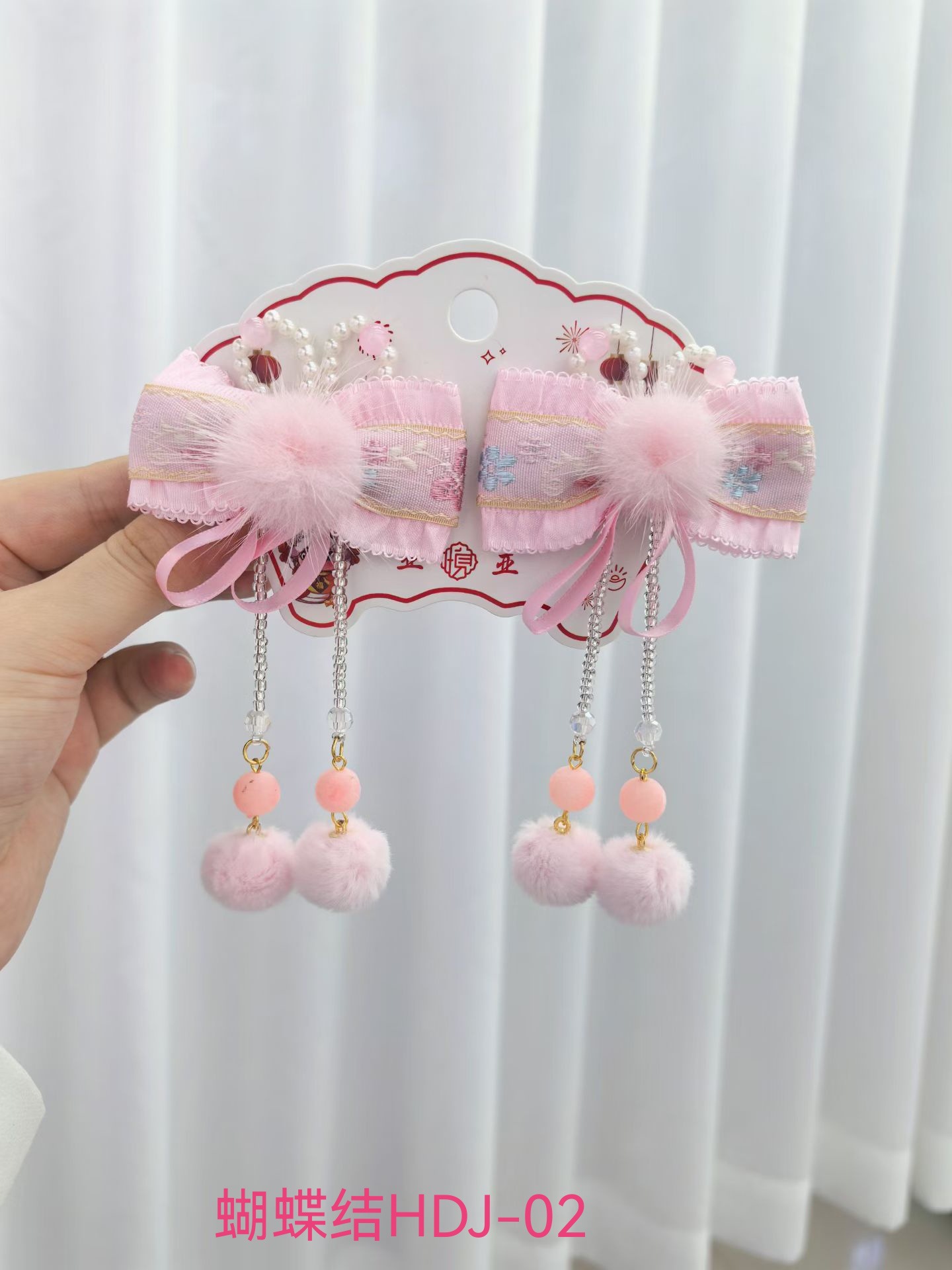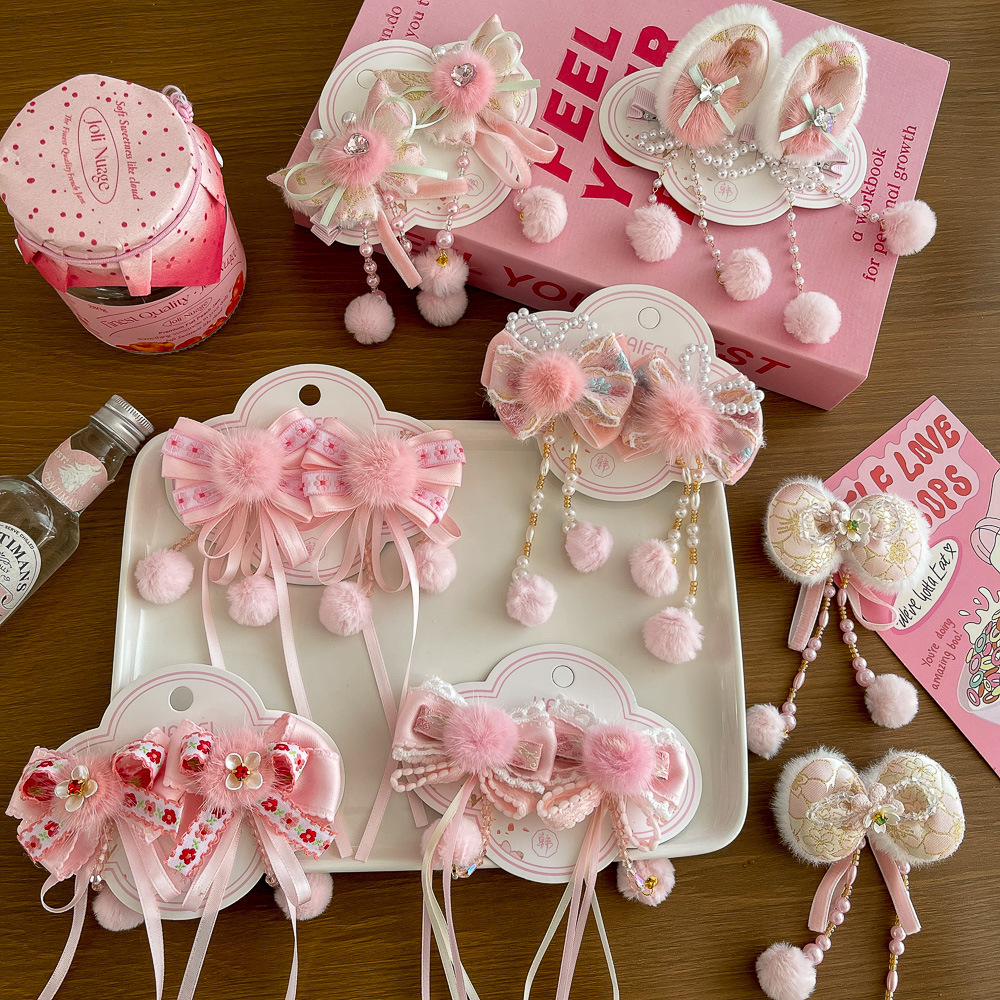 儿童新款温柔粉色系毛绒蝴蝶结流苏发夹甜美发饰气质古风女孩头饰