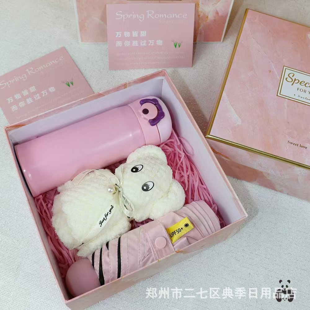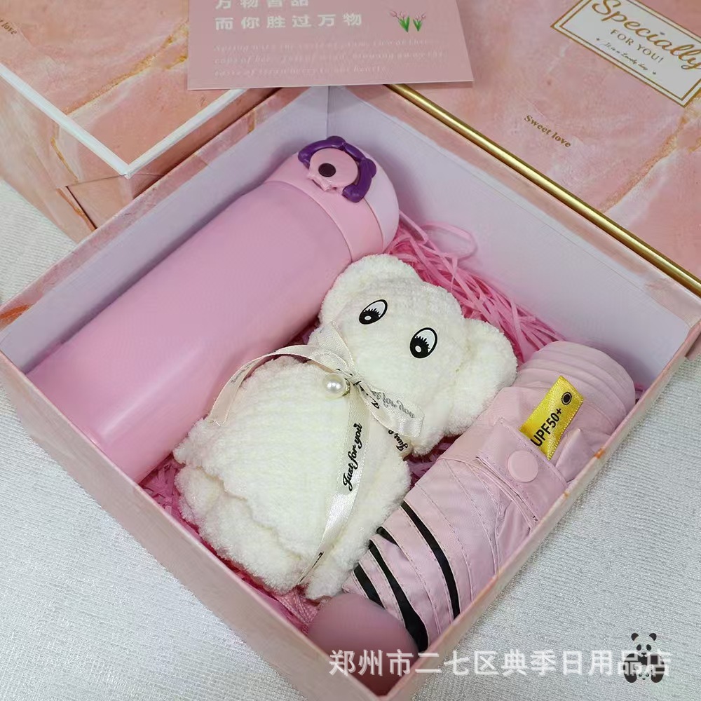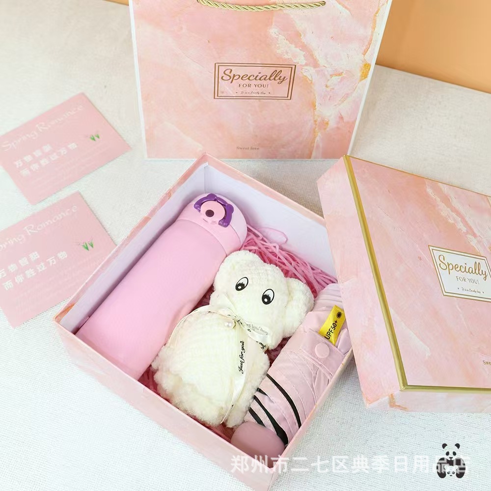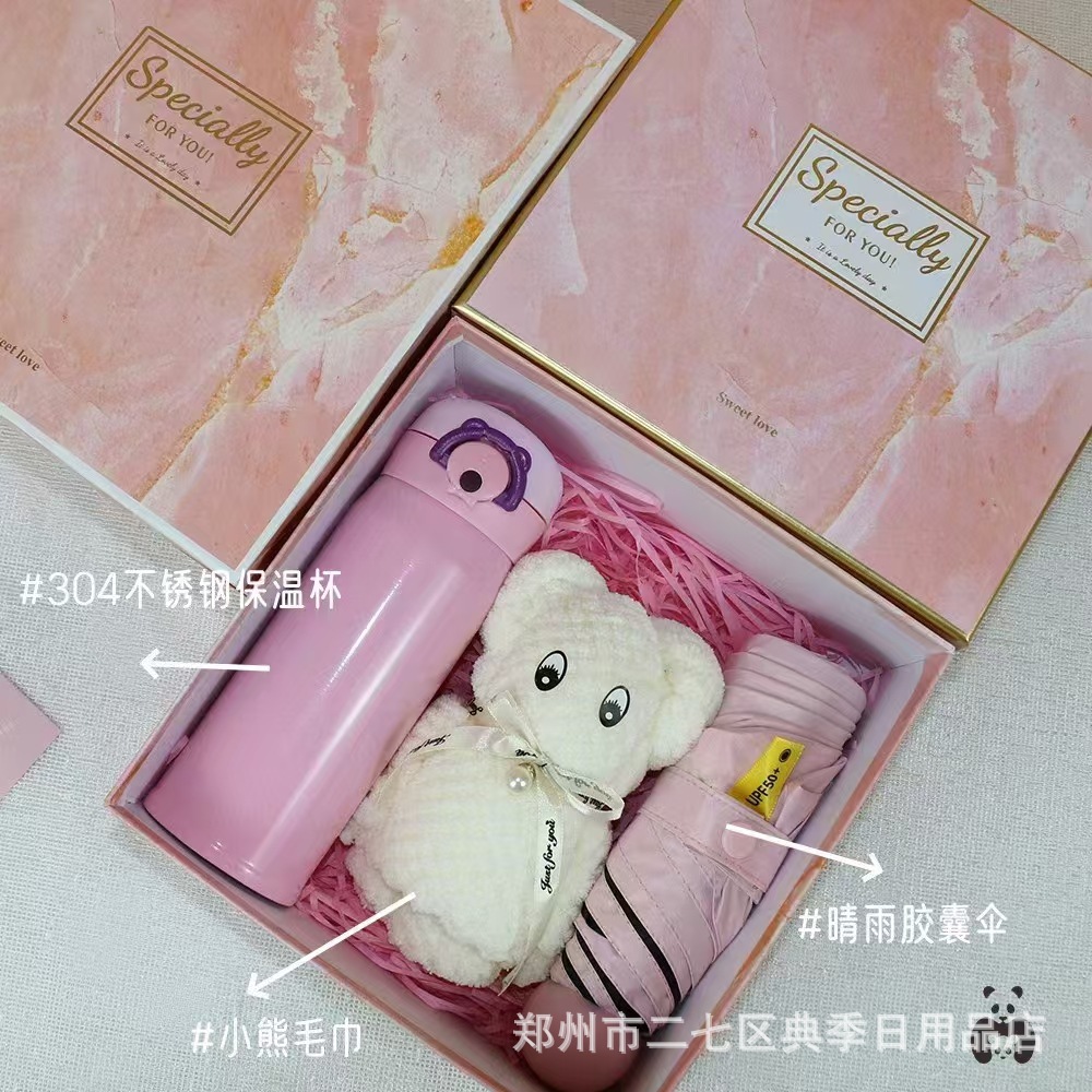 商品番号 ピンク色#ピンクの美しいお土産、あなたを暖かく保ちます | 風と雨を防ぐ魔法瓶カップ、晴雨兼用カプセル傘、クマのタオル ギフトボックス 20*20*9.5cm