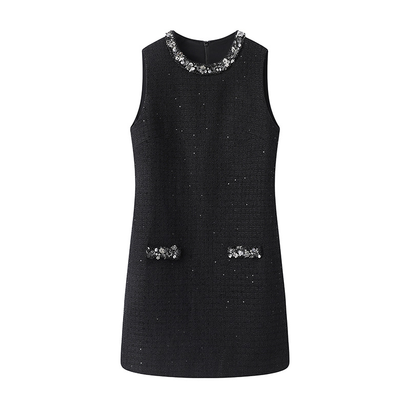 法式优雅2024秋冬新款女黑色圆领镶嵌珠片挂脖无袖连衣裙