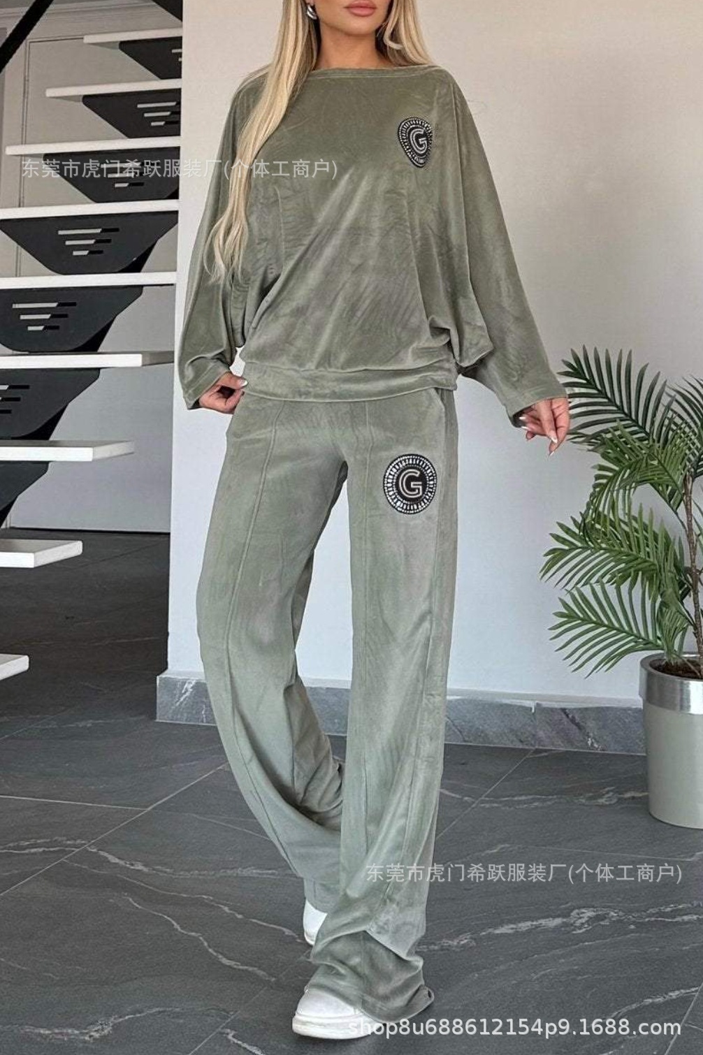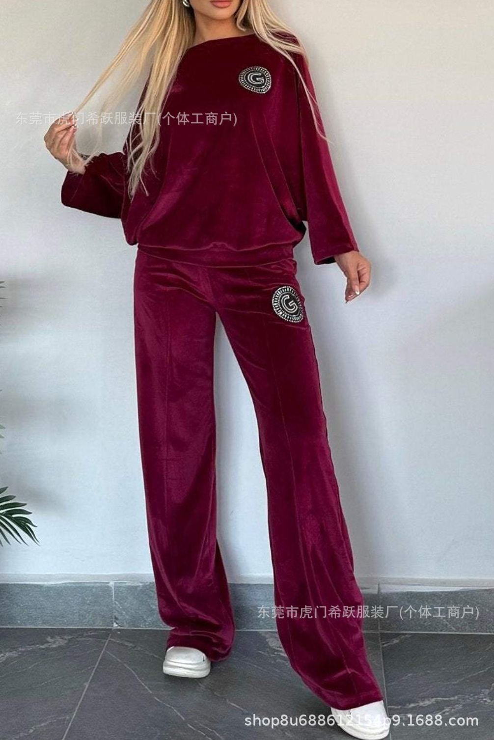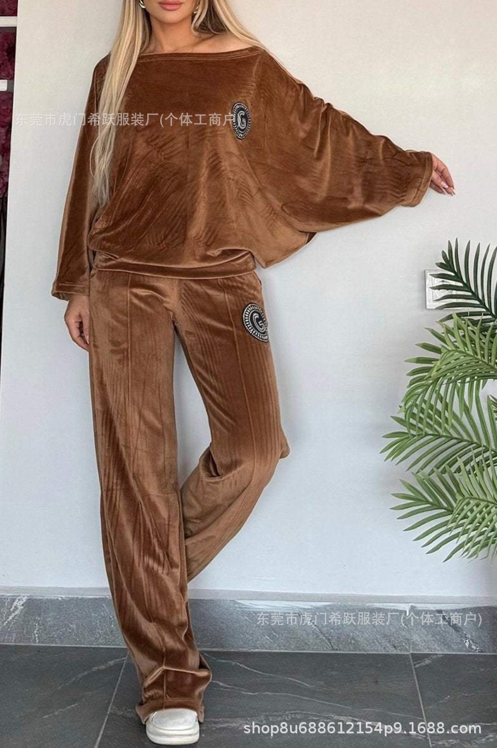 2024欧美跨境爆款女装春秋金丝绒纯色圆领蝙蝠袖休闲两件套女装