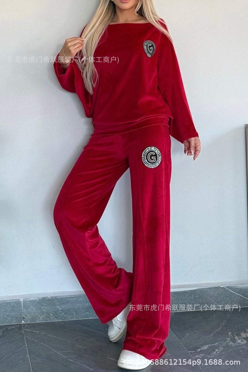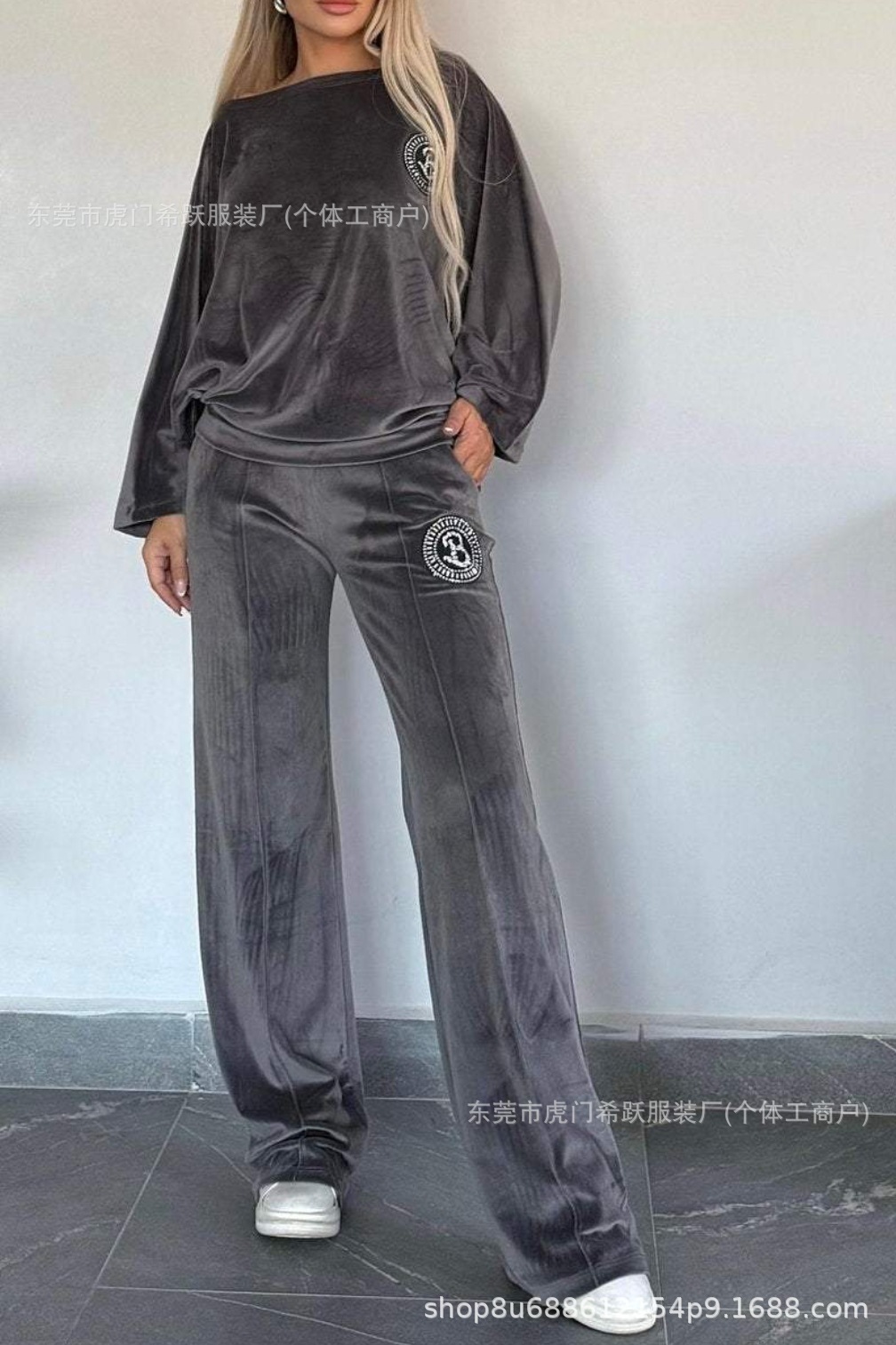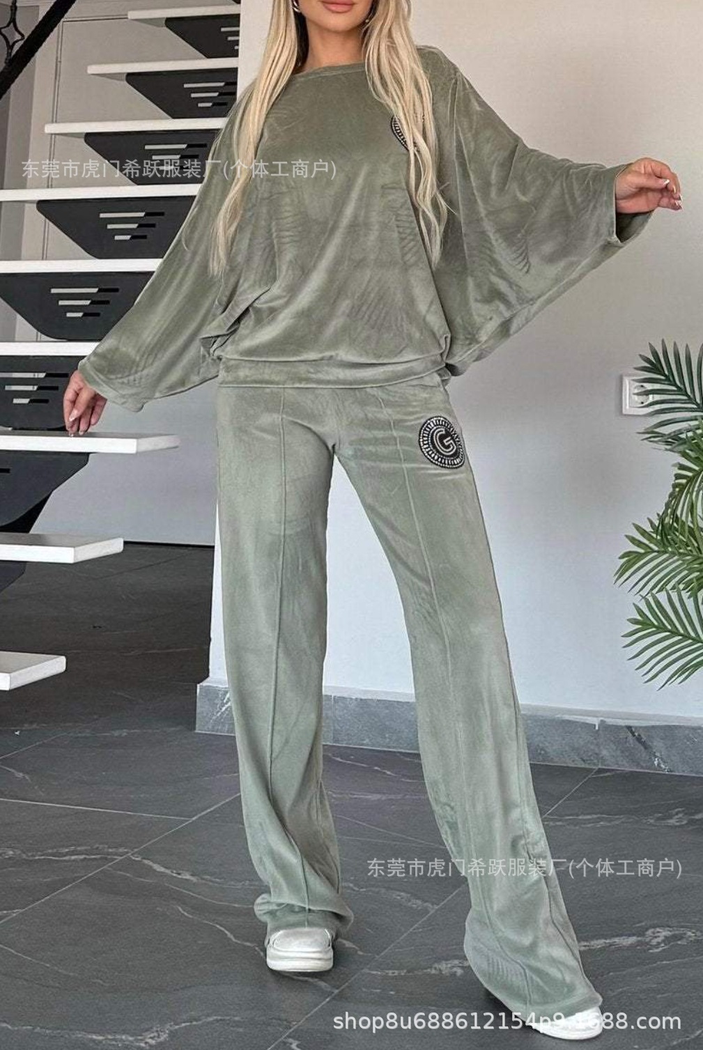 2024欧美跨境爆款女装春秋金丝绒纯色圆领蝙蝠袖休闲两件套女装