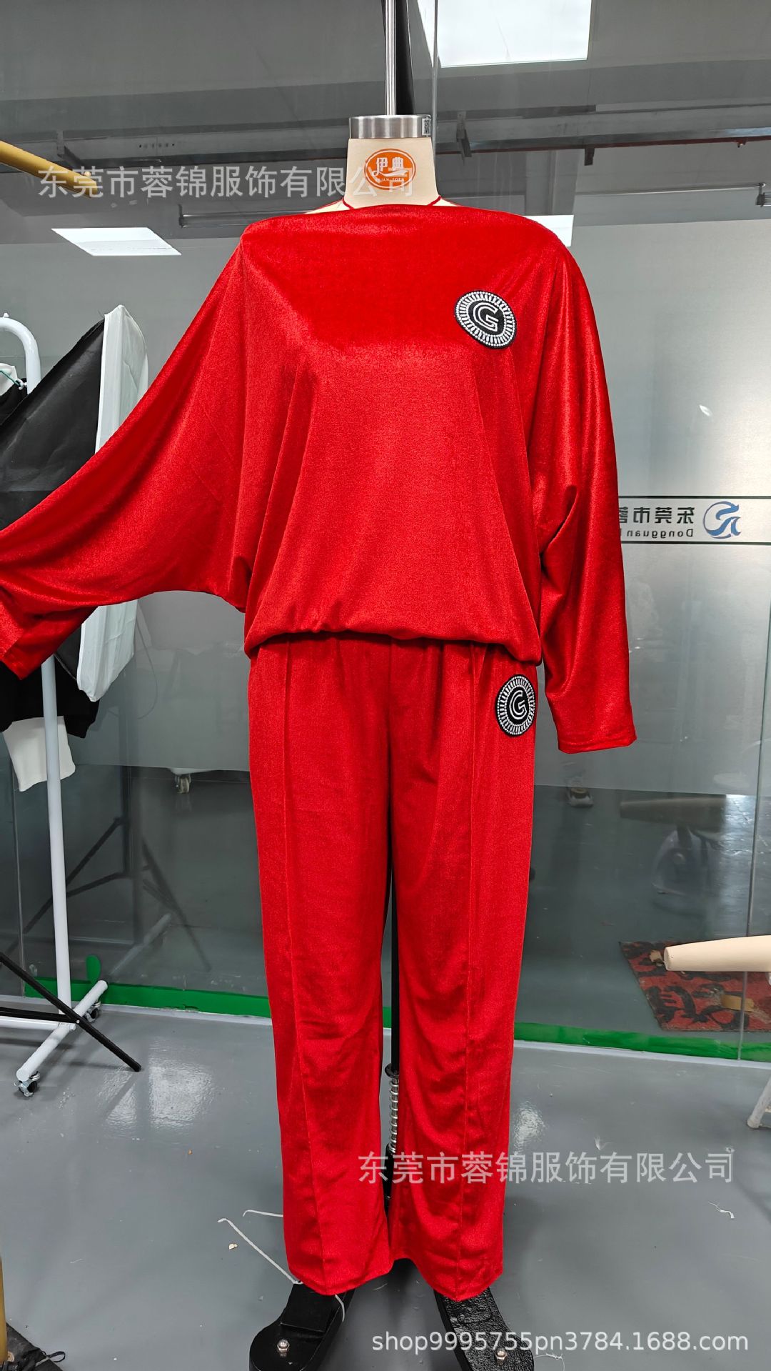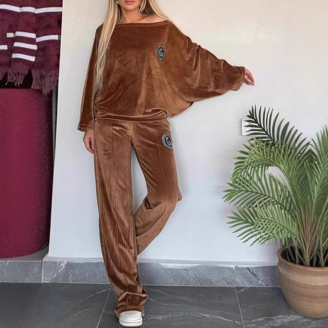 2024欧米の国境を越えて起爆した女装春秋金のベルベットの純色の丸首のコウモリの袖のカジュアルな2セットの女装
