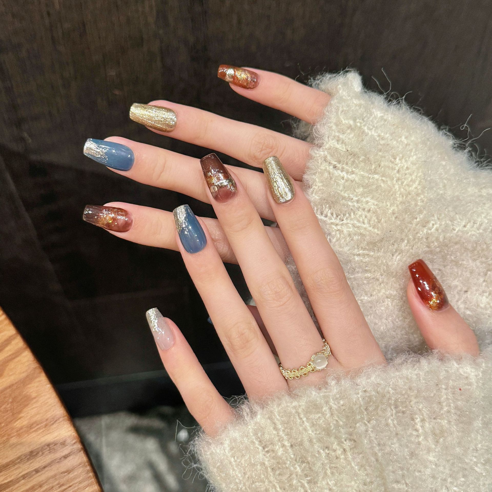 イーホーネイル 秋冬美白メタリックテクスチャーブレンド ウッドリーフオータムサウンド メイラードコントラストカラー シンプルつけ爪