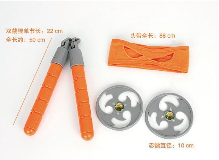 这个组合的忍者武器一箱是四款混装,龟壳颜色和武器组合也是随机的,龟壳大小是27*38CM左右,适合小学以内的小孩子戴着,