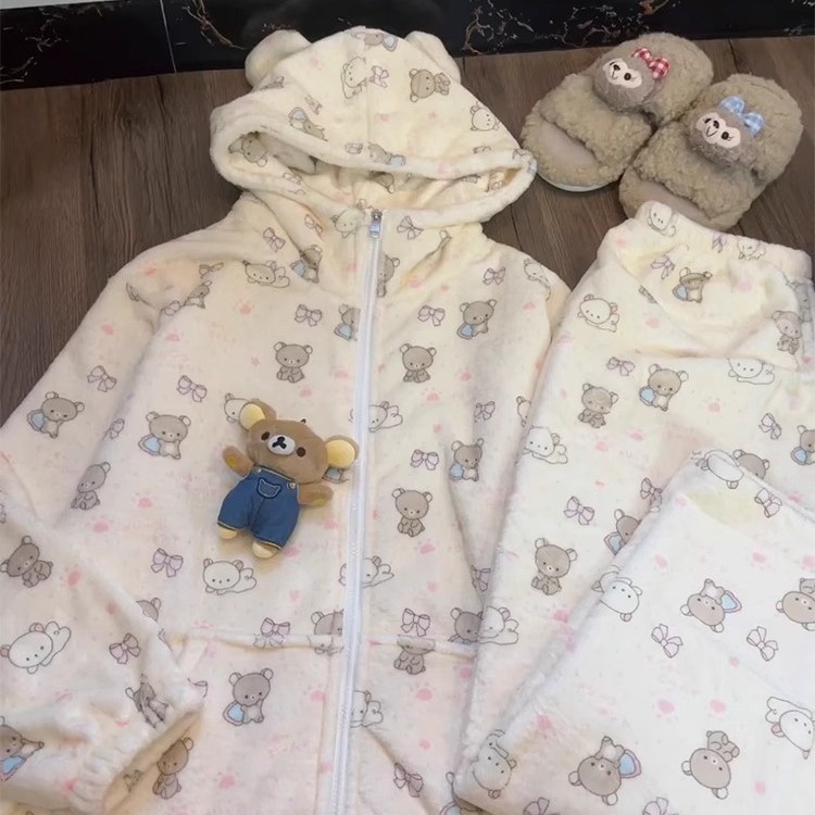 フード付きジッパーリラックマフランネルパジャマ女性の秋と冬厚く暖かい学生かわいい漫画ホーム服セット