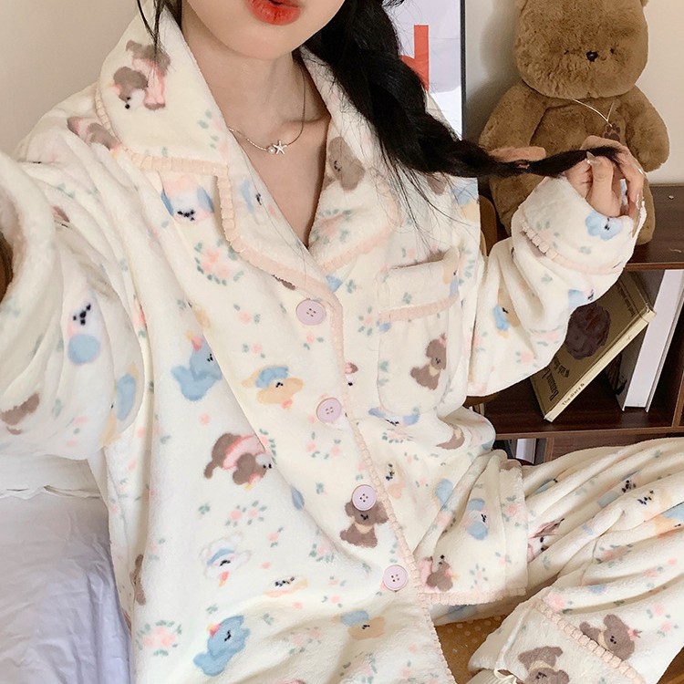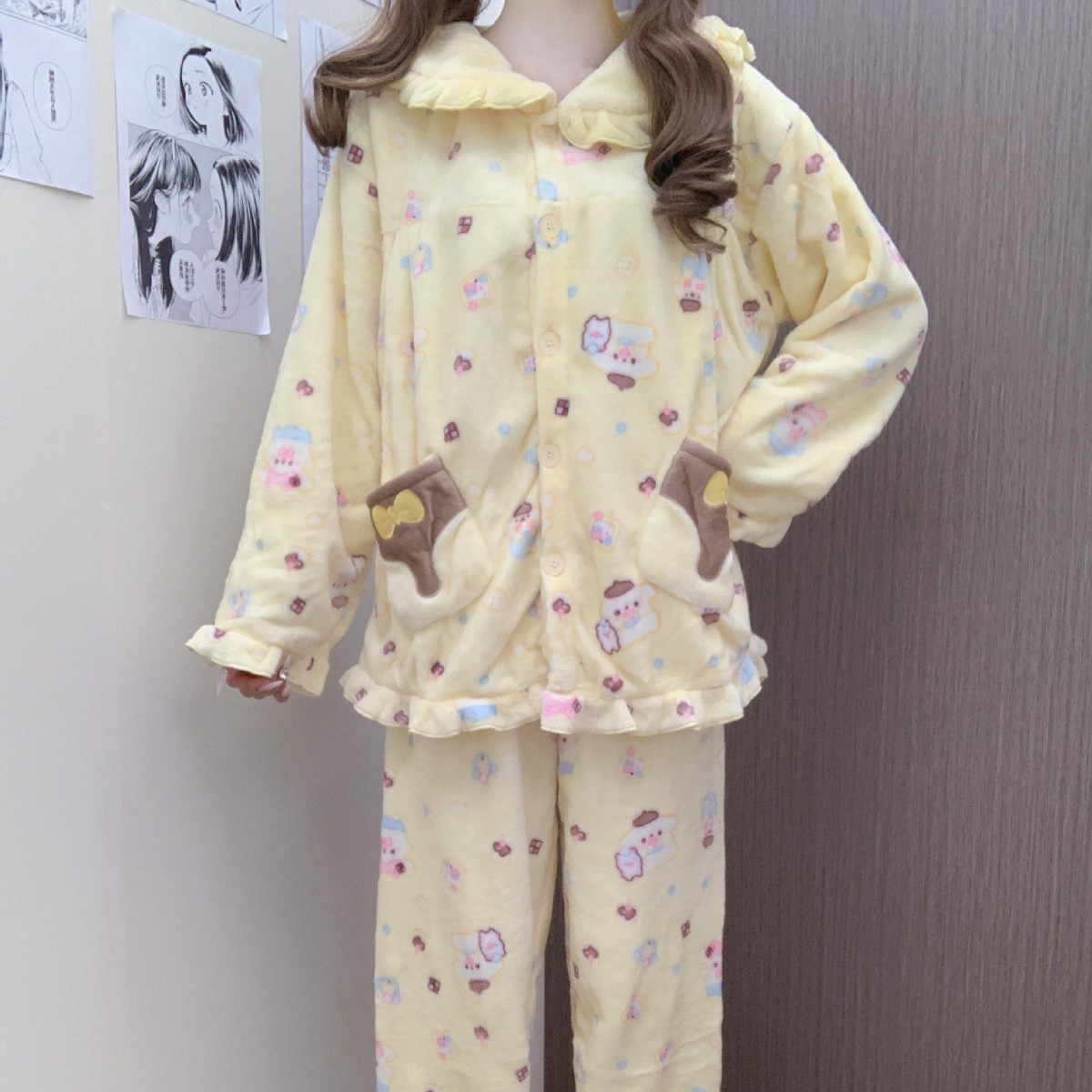 奶黄布丁狗法兰绒睡衣秋冬卡通少女家居服软妹可爱印花娃娃领套装
