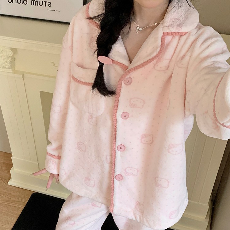 HelloKitty珊瑚绒睡衣女加厚款秋冬季天凯蒂猫法兰绒奶fufu家居服