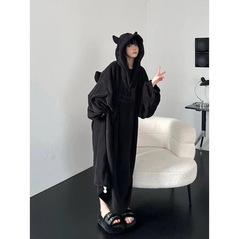 小悪魔の寝衣秋冬の新型の帽子のパジャマとベルベットの厚い家の服の男女のカップルの刺繍のゆったりした服