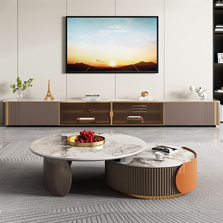 スレートコーヒーテーブルテレビキャビネット組み合わせセットモダンなステンレス鋼の小さなアパートメントペイントホームライト高級大小ラウンドコーヒーテーブル