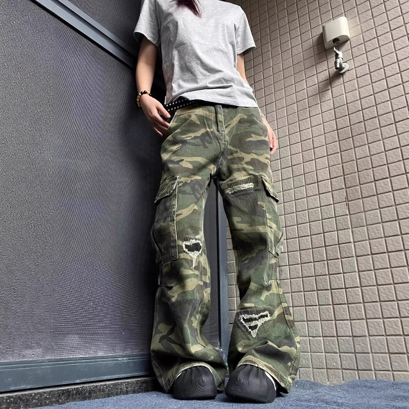 美式复古水洗做旧迷彩割破vibe多口袋工装裤男女直筒微喇牛仔裤男