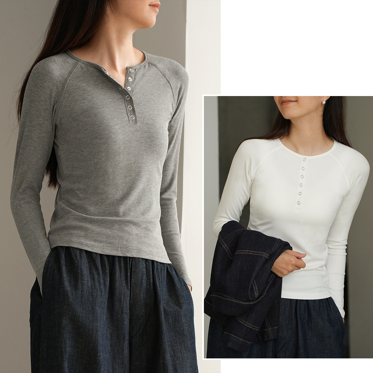 ヘンリー襟の女性の高弾力の修身の底のシャツのリブの長袖のtシャツの丸首の上着の春秋のタイプの婦人服