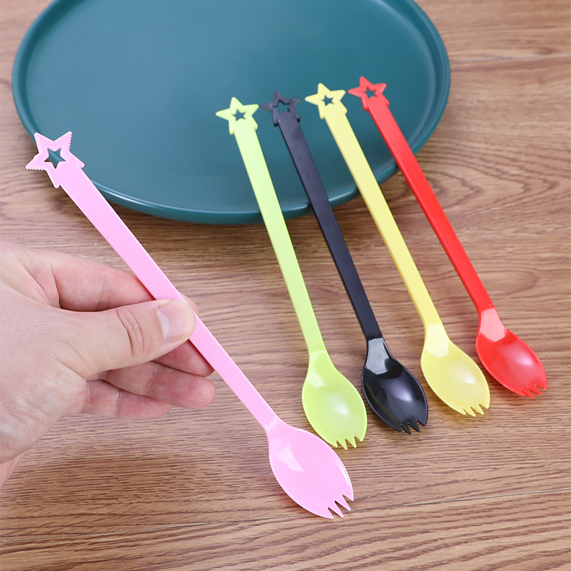 使い捨て長柄果物茶フォークスプーン独立712延長五角星フォークプラスチック両用一体三歯スプーン