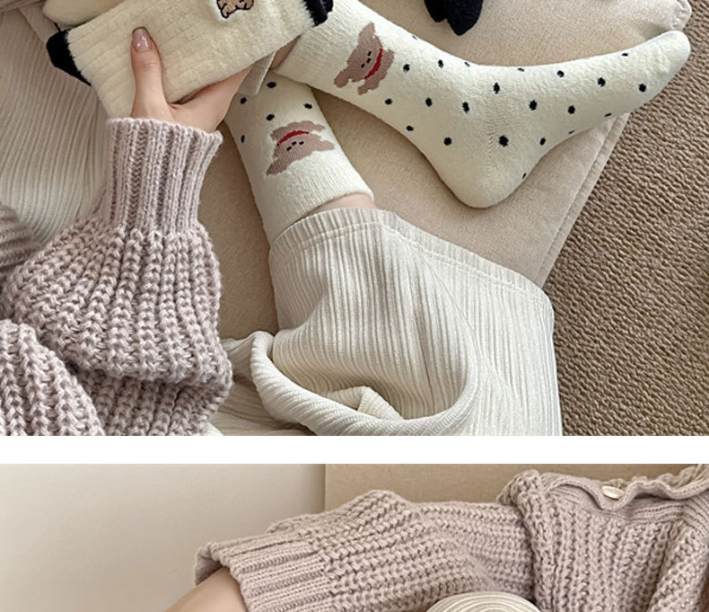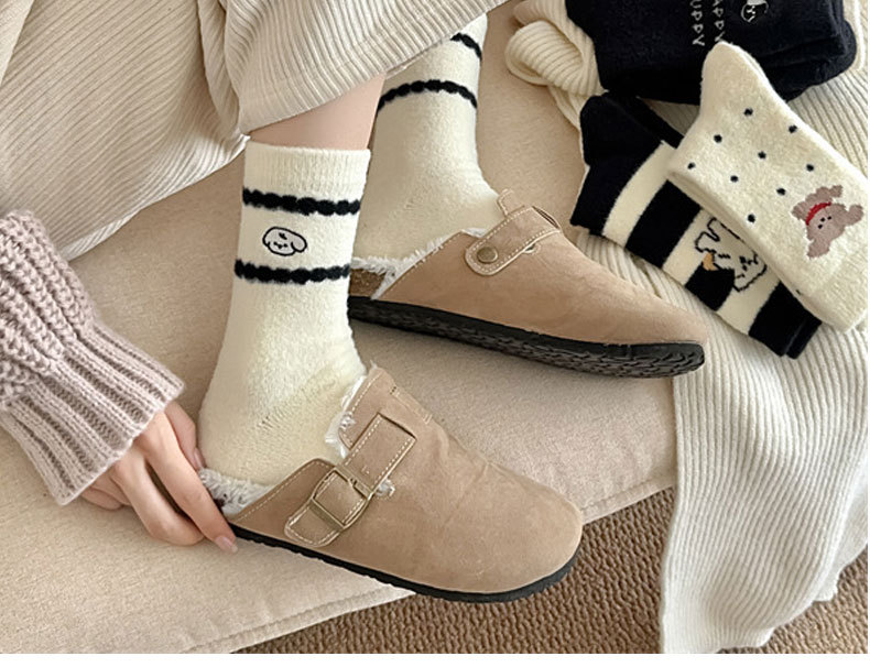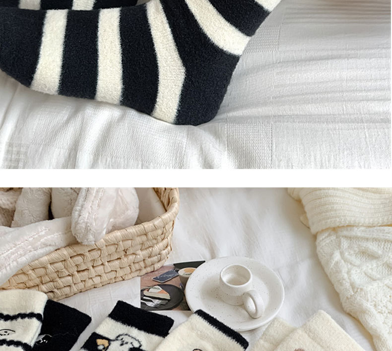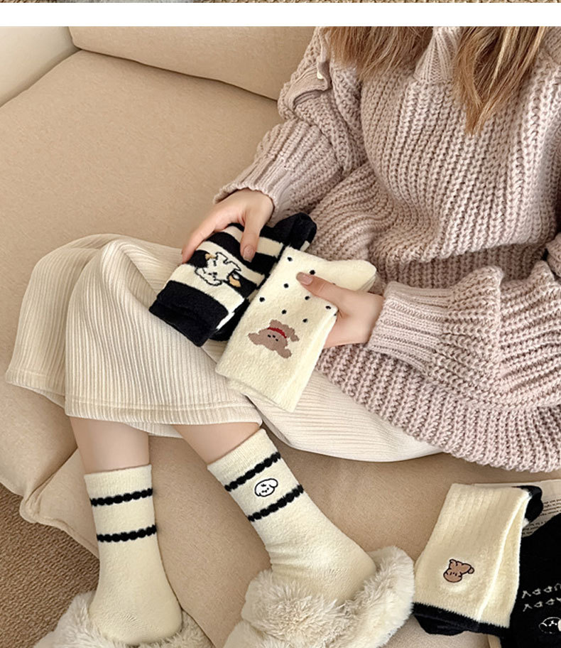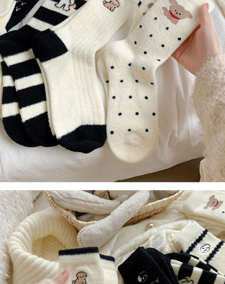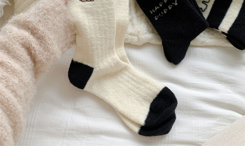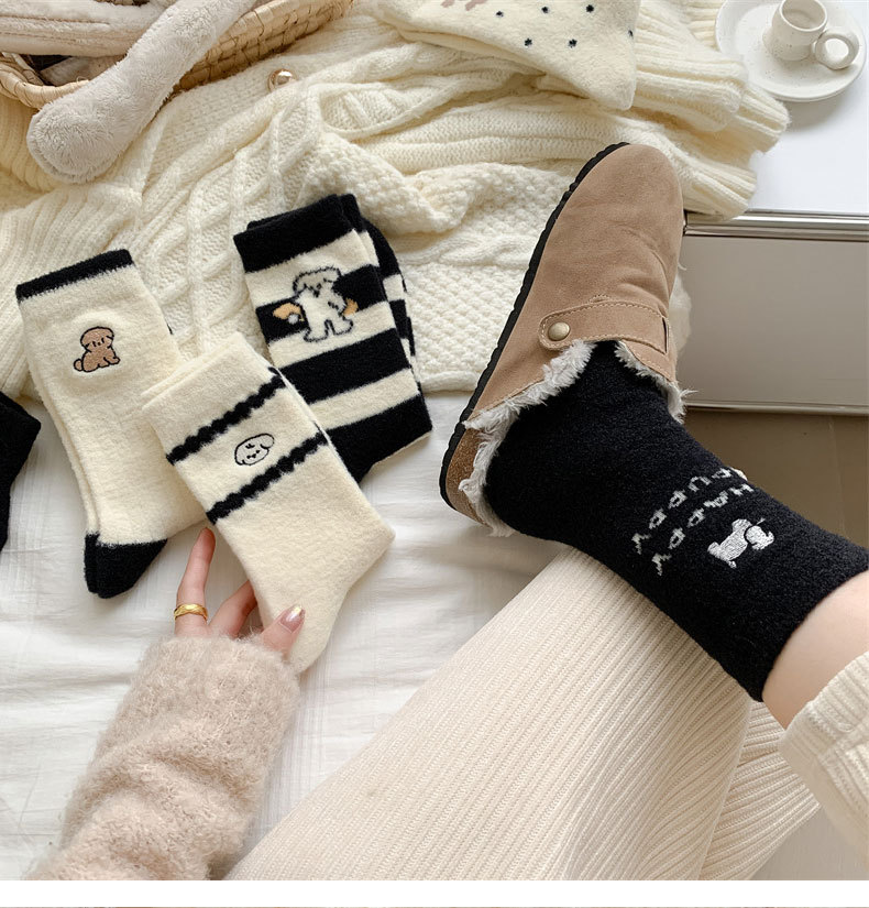 秋冬のベルベットは保温性の高い女性靴下の白黒刺繍がかわいい子犬の中筒靴下の日系オーストラリアのベルベット靴下を厚くした