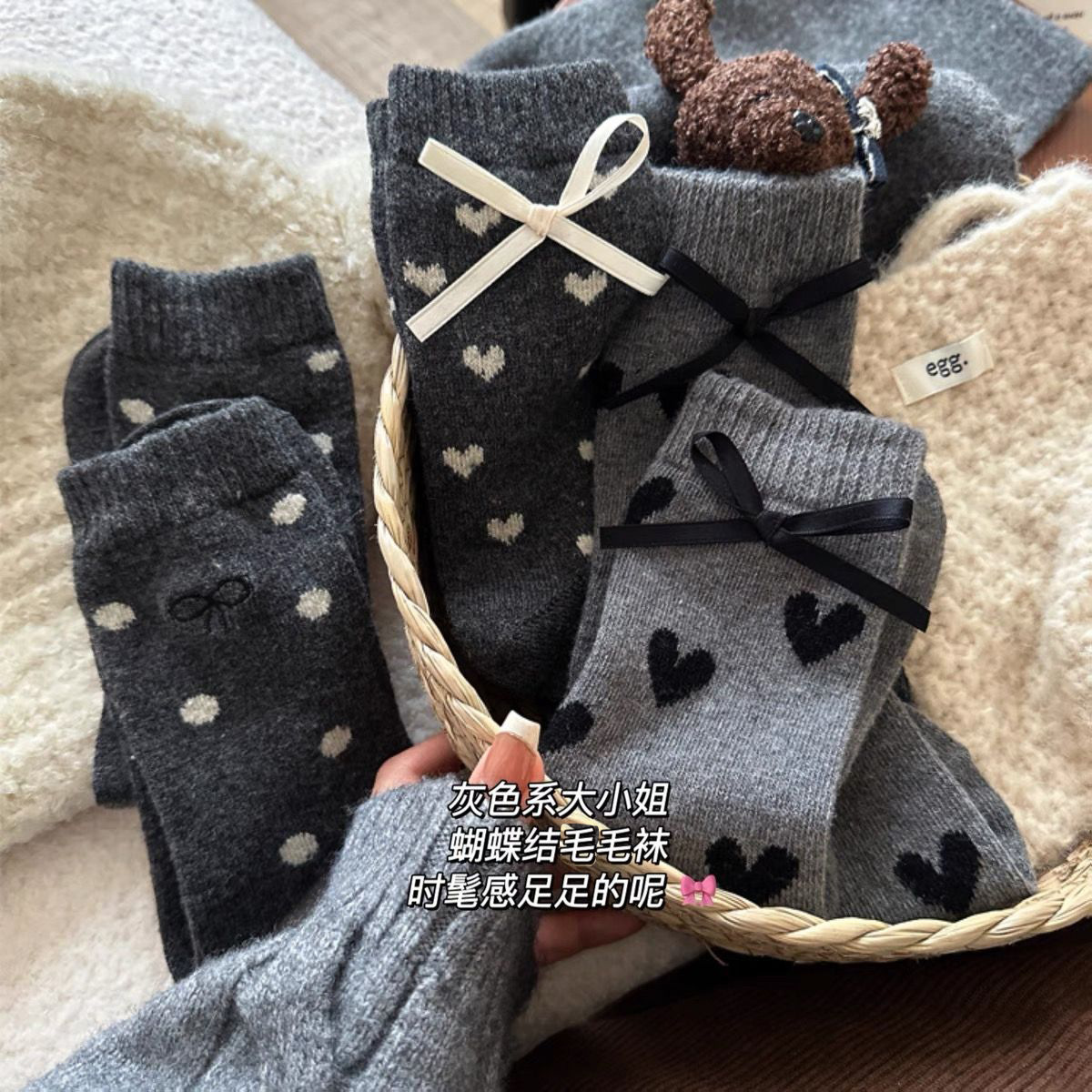 女性の靴下の冬の厚い愛の波のポイントの蝶結びの韓国系の保温の灰色の靴下の保温の山の靴下の女性の中筒の靴下