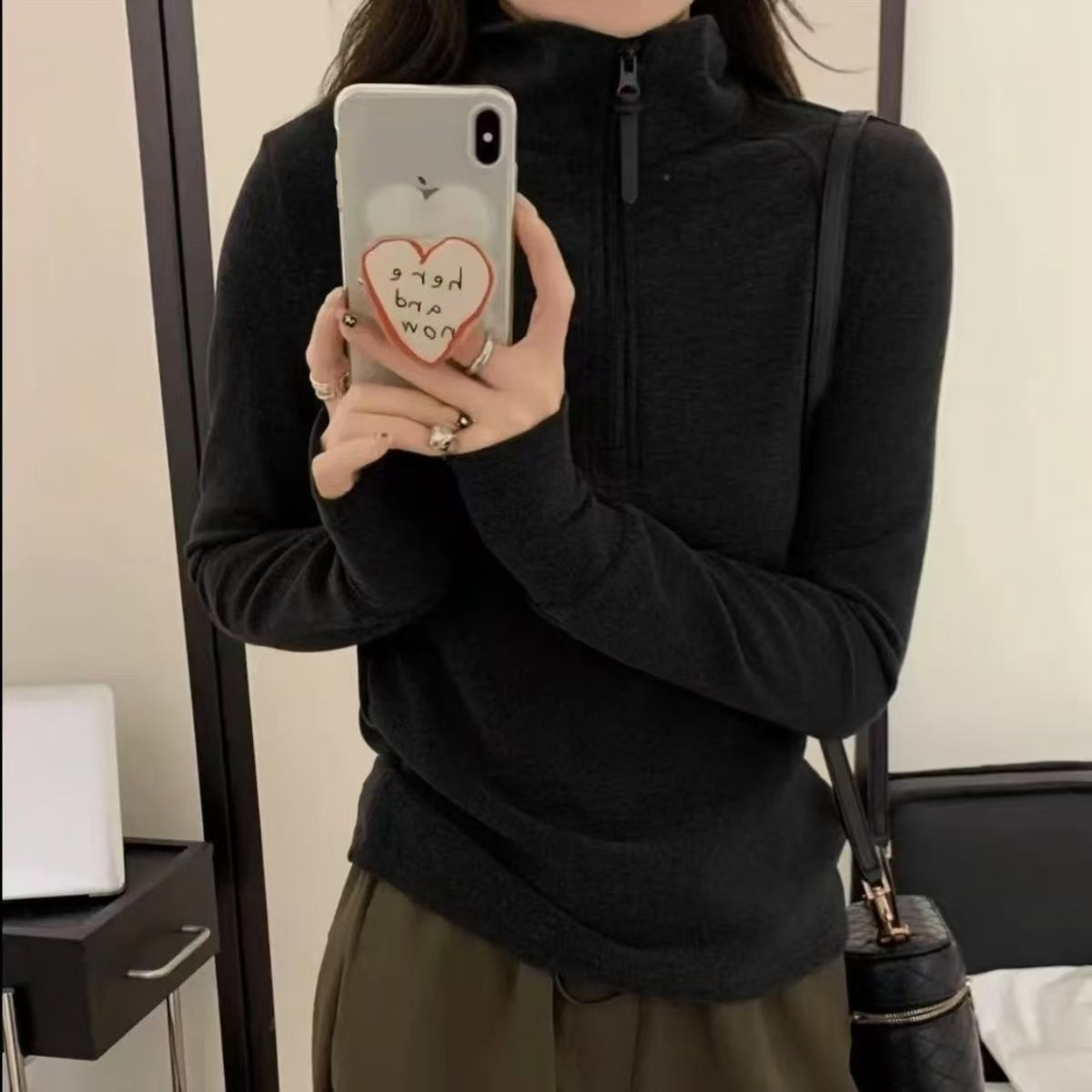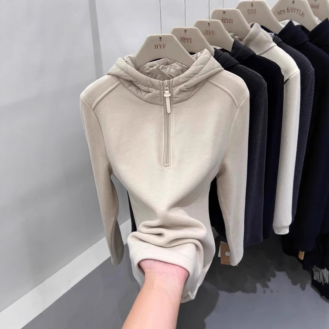 加厚德绒韩版小众别致连帽磨毛打底衫女秋冬气质百搭半拉链上衣潮