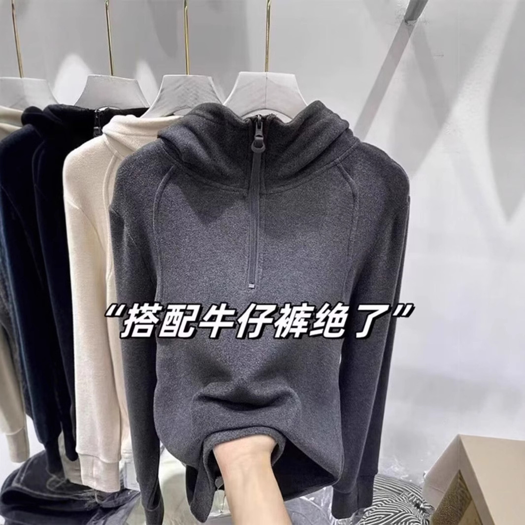 半拉链双面磨毛德绒长袖卫衣连帽衫女秋冬新款内搭打底衫厚实上衣