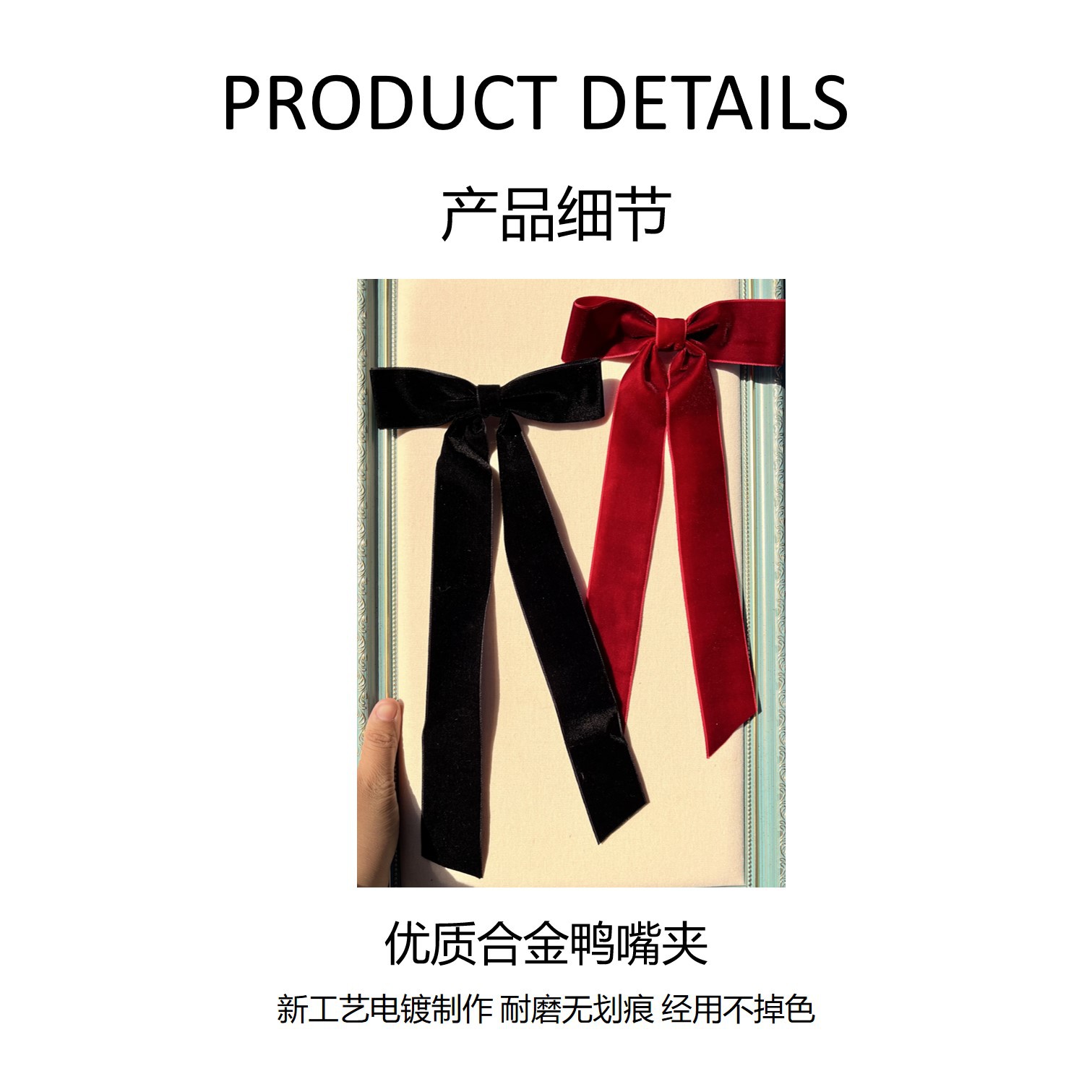 大きい蝶結びの髪はワインの赤い色を挟みます。