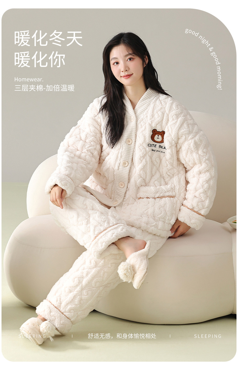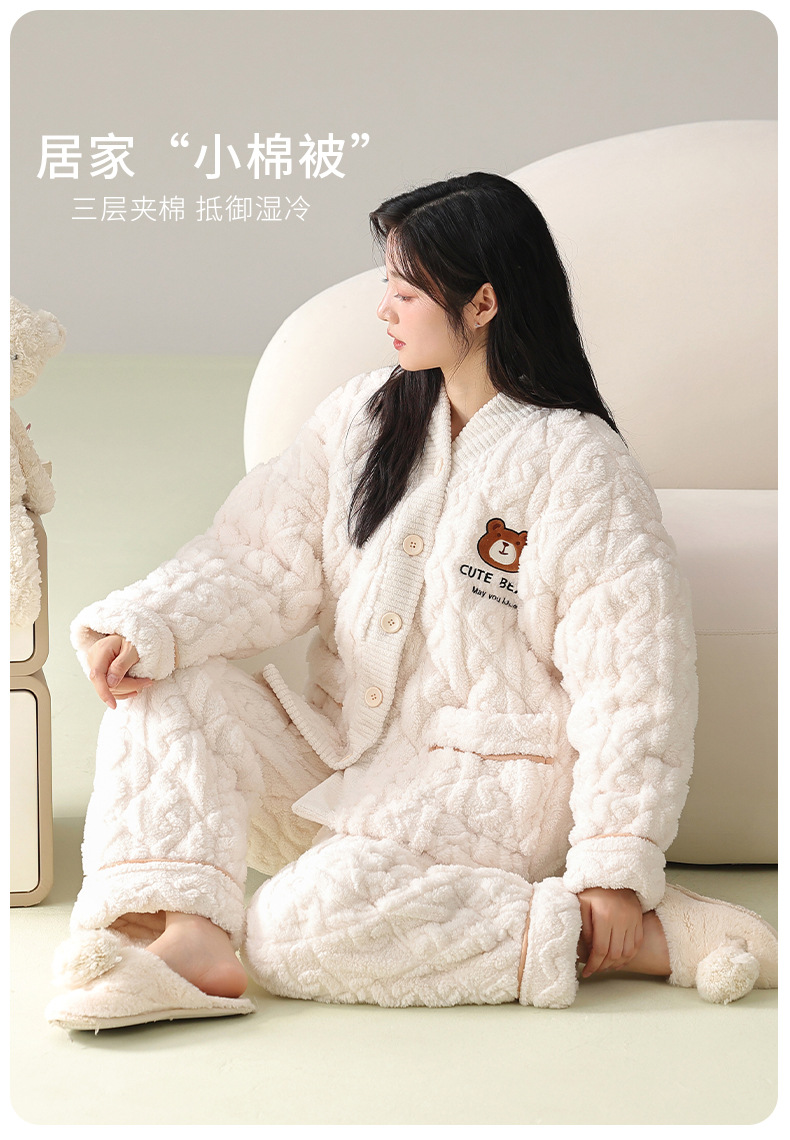 新しい冬の女性のパジャマの珊瑚の絨毯の3層は綿を挟んで厚い金の保温vネックをプラスして部屋の服のスーツを着ることができます。