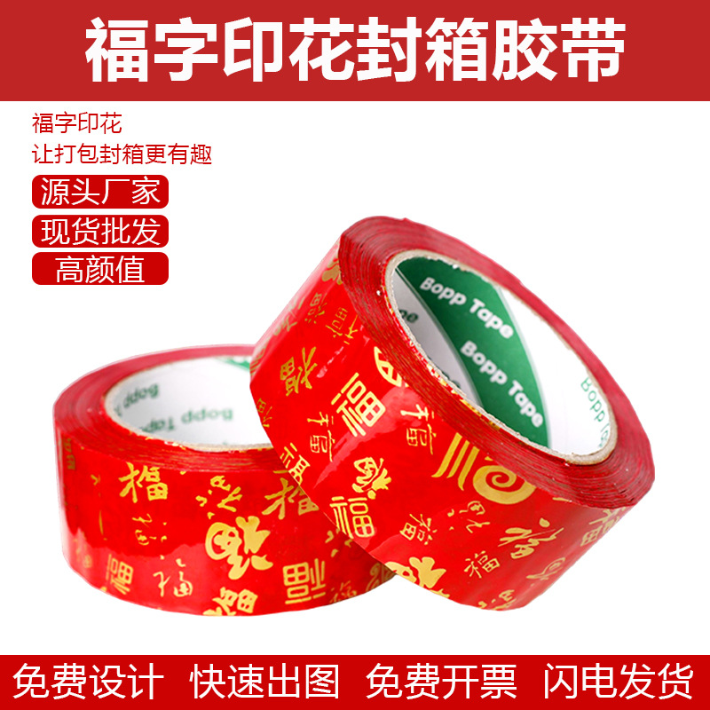 新年の赤い底の金色の福の字は箱のテープの物流を密封します。