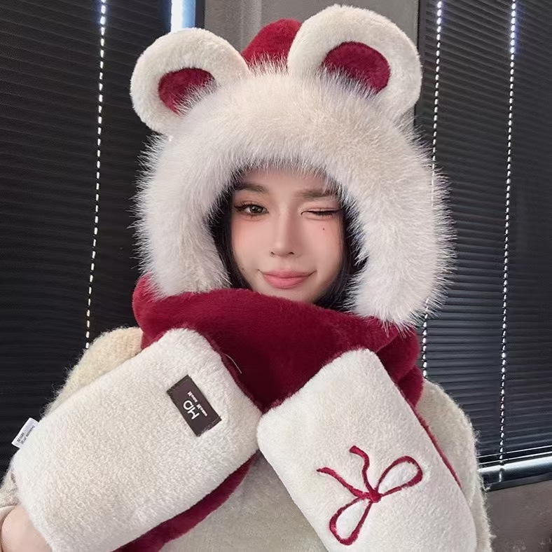 新商品2024甘美少女蝶結び保温三点セット冬自転車防風マフラー手袋一体帽子