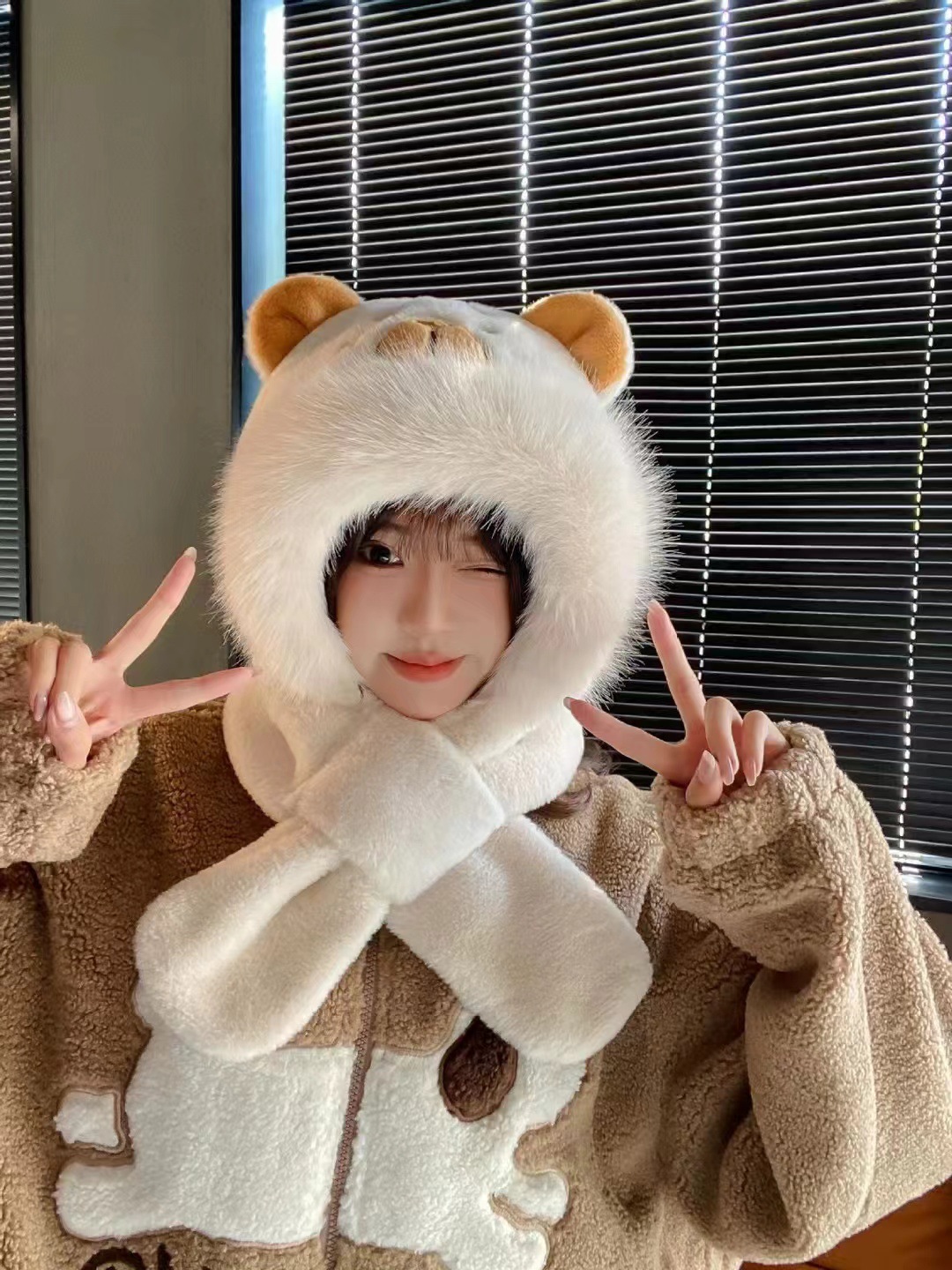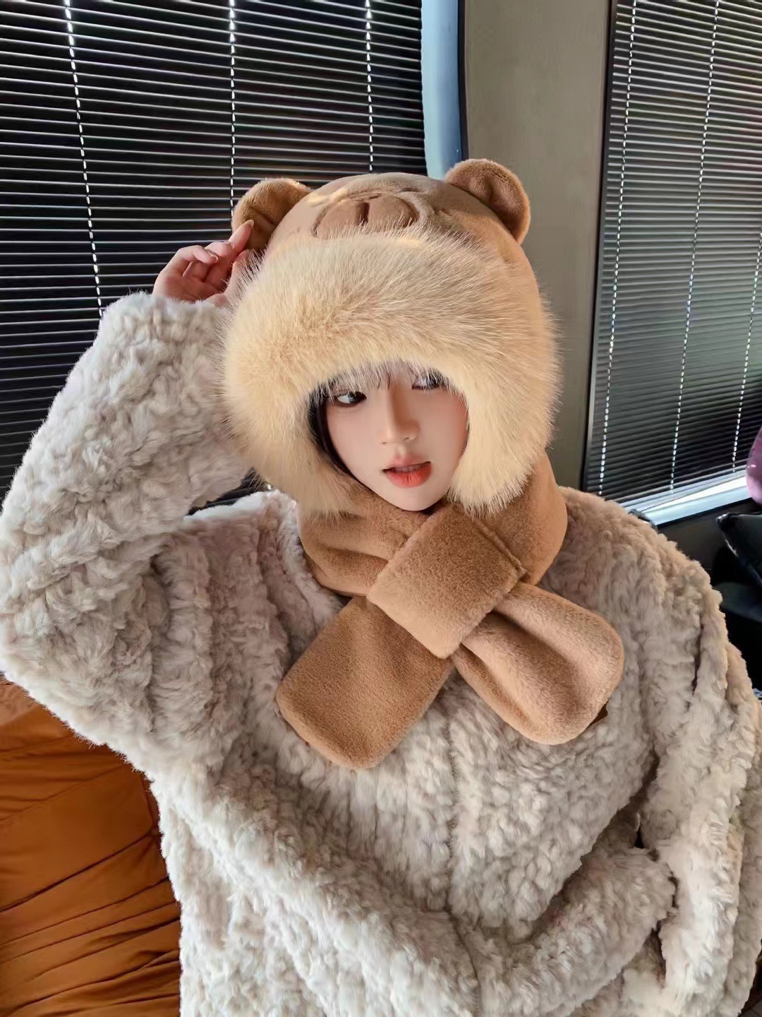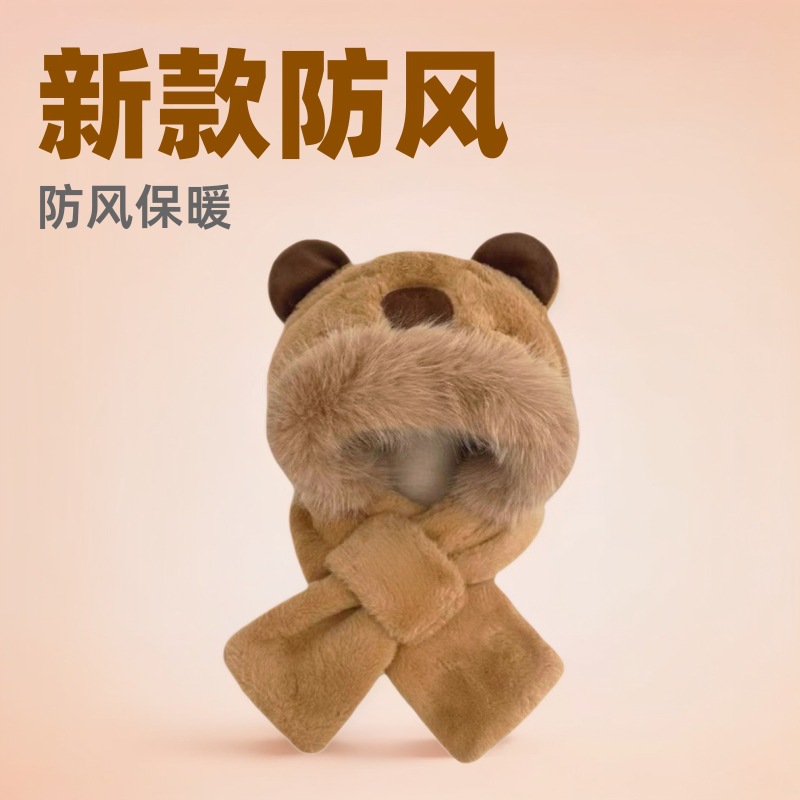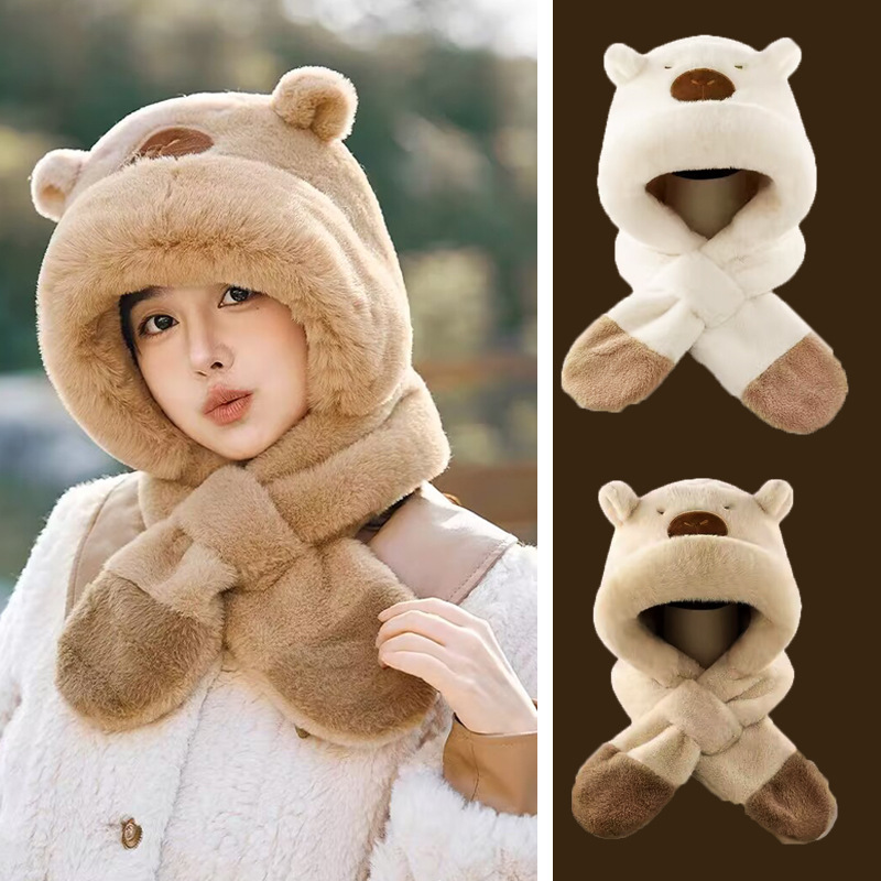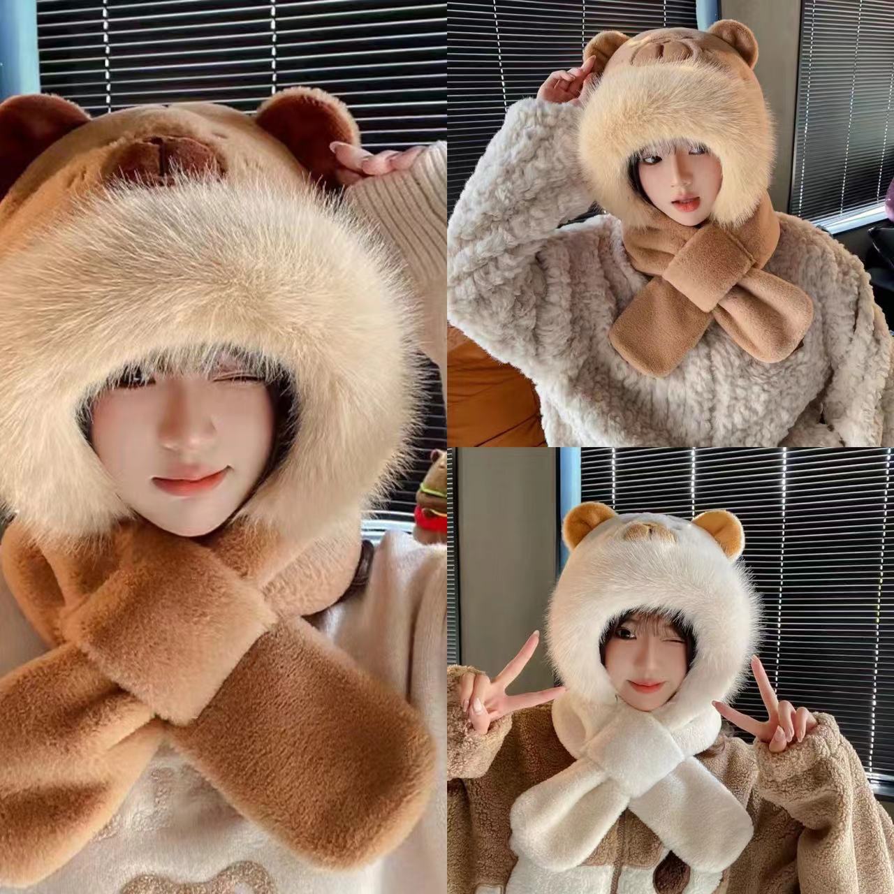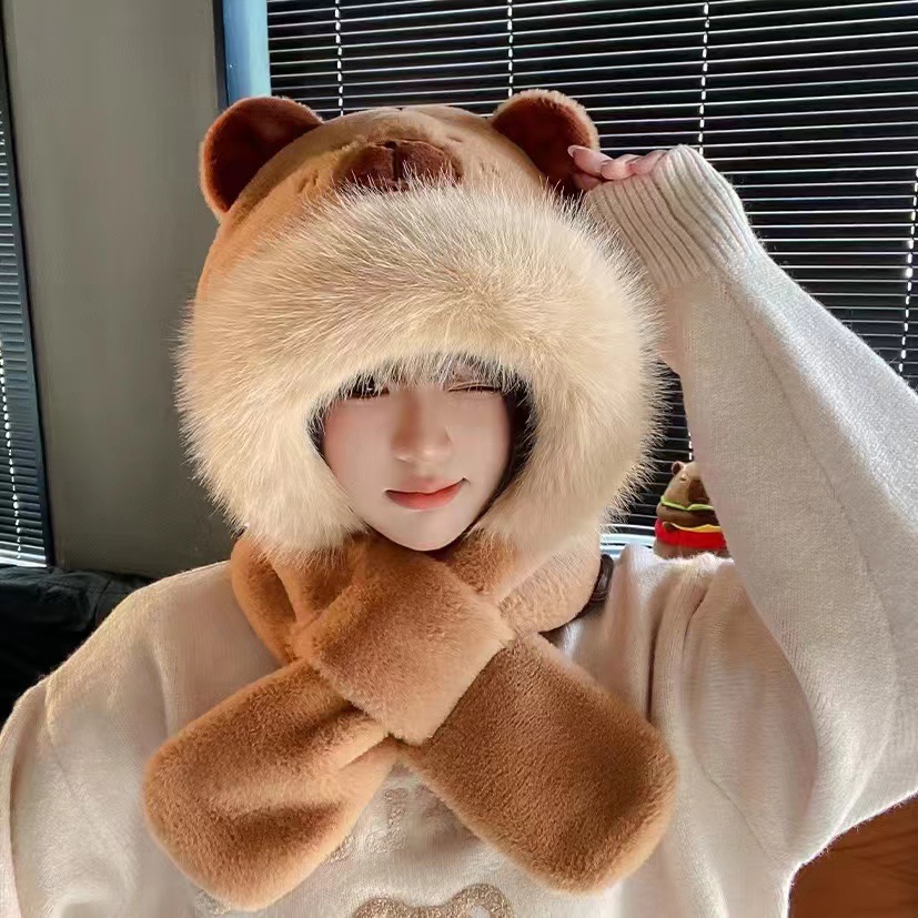 秋冬新款帽子女卡皮巴拉可爱毛绒围巾一体二件套保暖骑行护耳帽