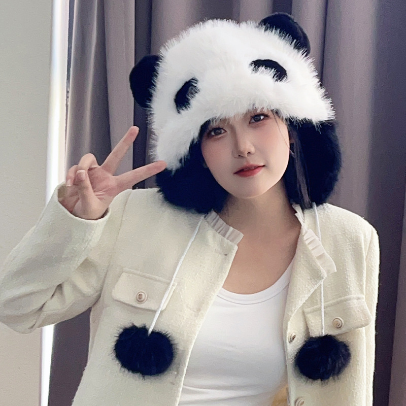 批发网红同款可爱熊猫三件套男女毛绒帽子围巾手套一体帽情侣骑行