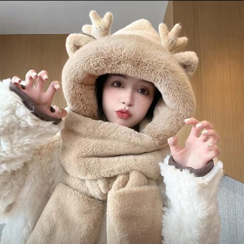 新款可爱毛绒狐狸耳帽子围巾一体女秋冬季保暖护耳连帽围脖