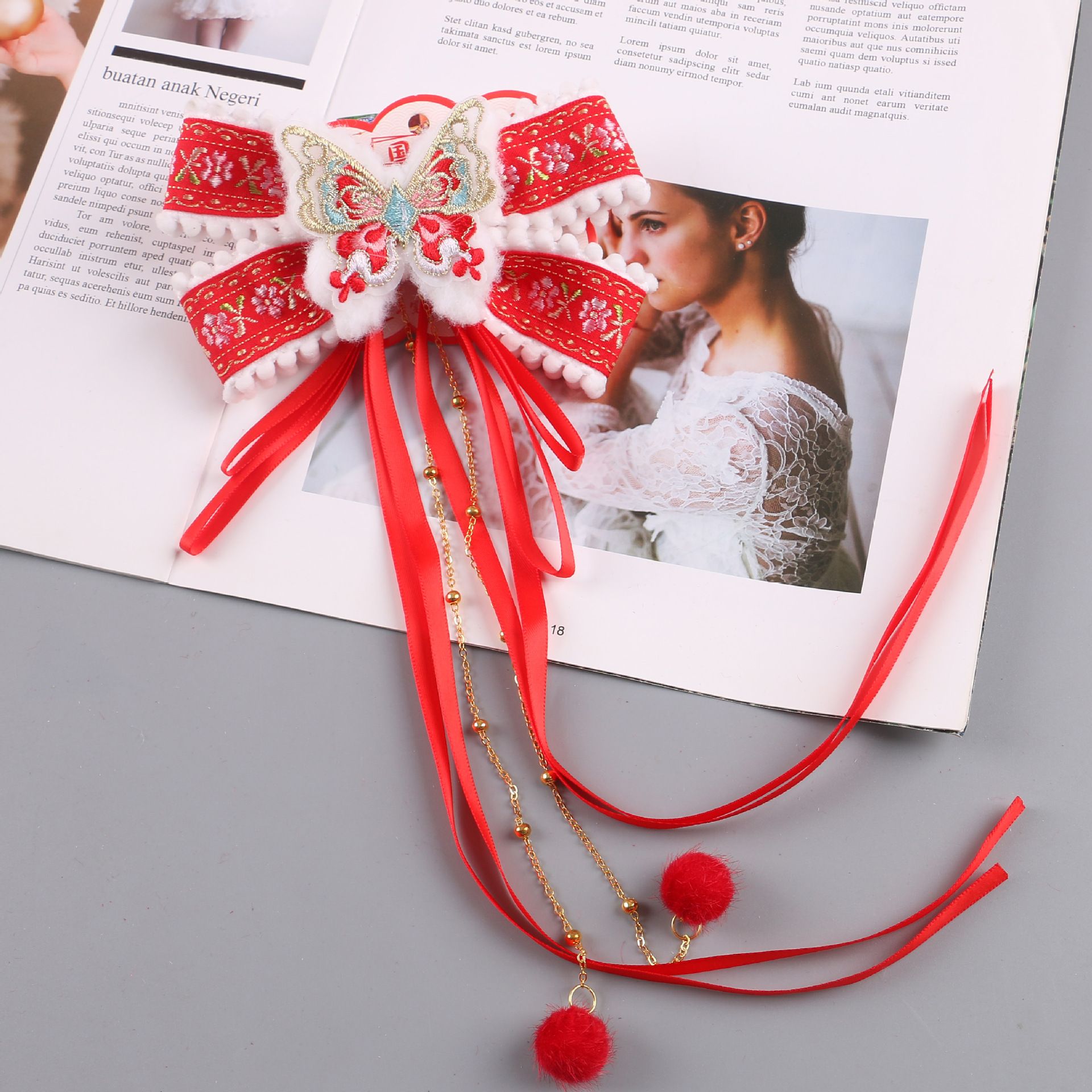 新款2026年蝴蝶结花朵发饰刺绣蝴蝶发夹红色飘带发夹过年发夹批发