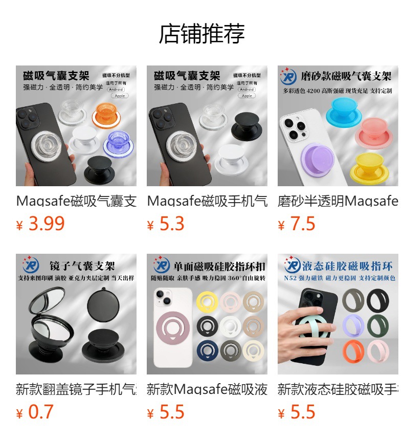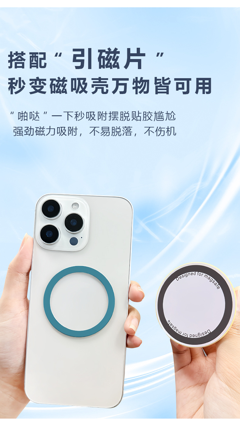 使用方法:收到产品后,引磁圈可能会粘贴在支架底部,先拿下引磁圈后将其粘贴在手机壳上,静等12-24小时粘贴更加牢固后可直接使用磁吸气囊支架即可!如果是手机壳本身就有引磁功能,(强磁)可以直接使用!产品优势所在,吸附于手机上,作用于手机支架,桌面支架,思考时还可以旋转拉伸,也可作于解压支架,伸缩档位让您放松心情;支持礼品定制logo,大量现货,工艺品制作,欢迎新老客户下单!