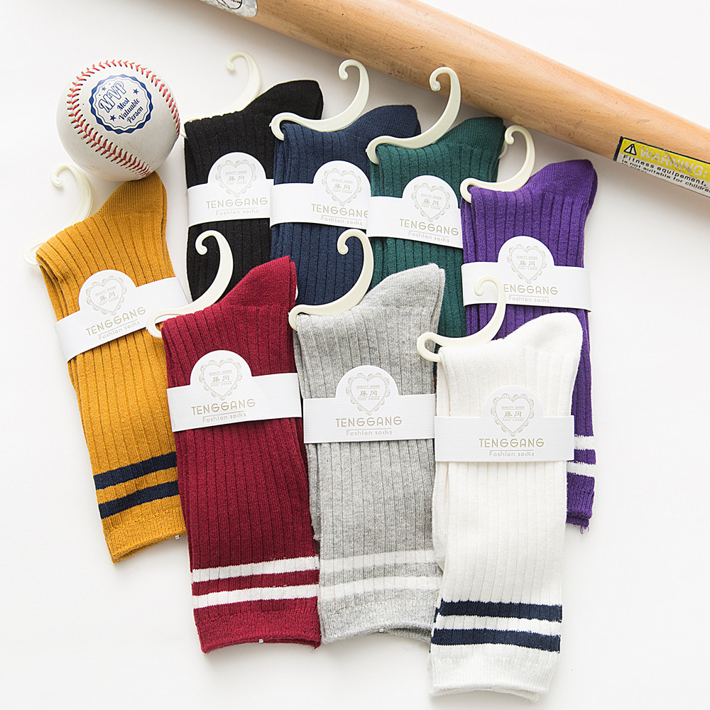 TENGGANG レディースソックス ストライプ柄 ダブルストライプ パイルソックス ミドル丈ソックス 綿ソックス 女子ソックス カレッジ風ソックス 卸売メーカー直販