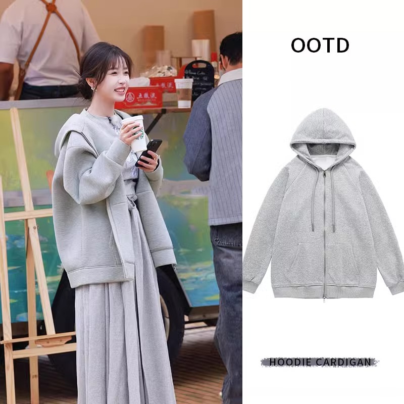 秋冬新作グレーのスウェットジャケット、韓国風ゆったりスタイル、秋の女性向け、初冬2025新作、フード付きコーデ。