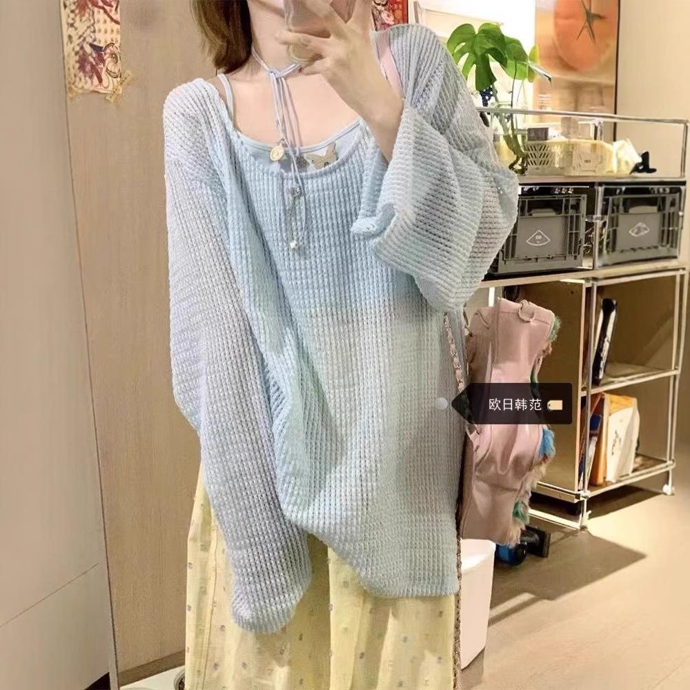 アイスシルクセーター女性の夏の新しいスタイル中空フレッシュで甘いブラウスラウンドネック長袖ルーズ日焼け止めトップトレンディ