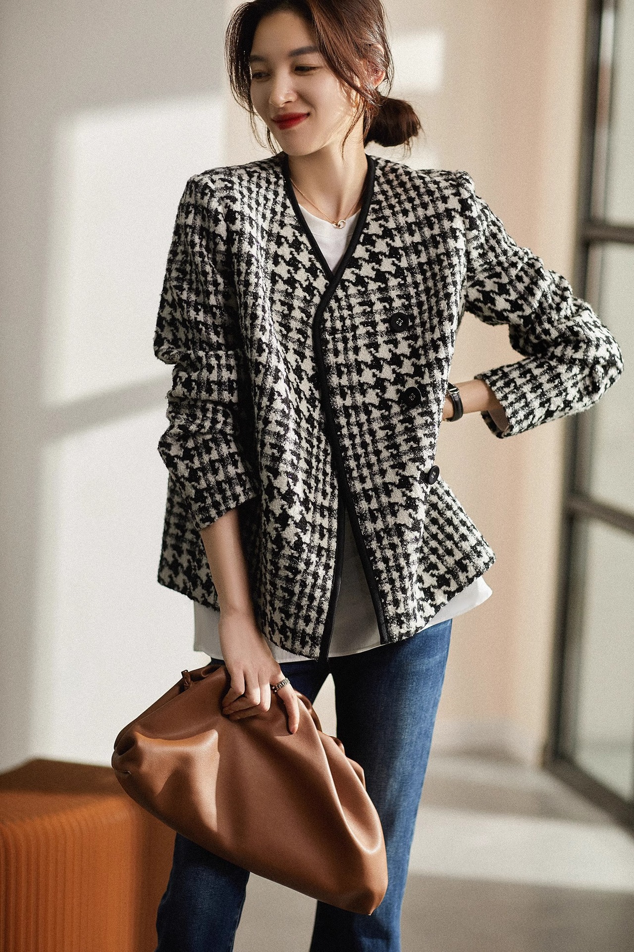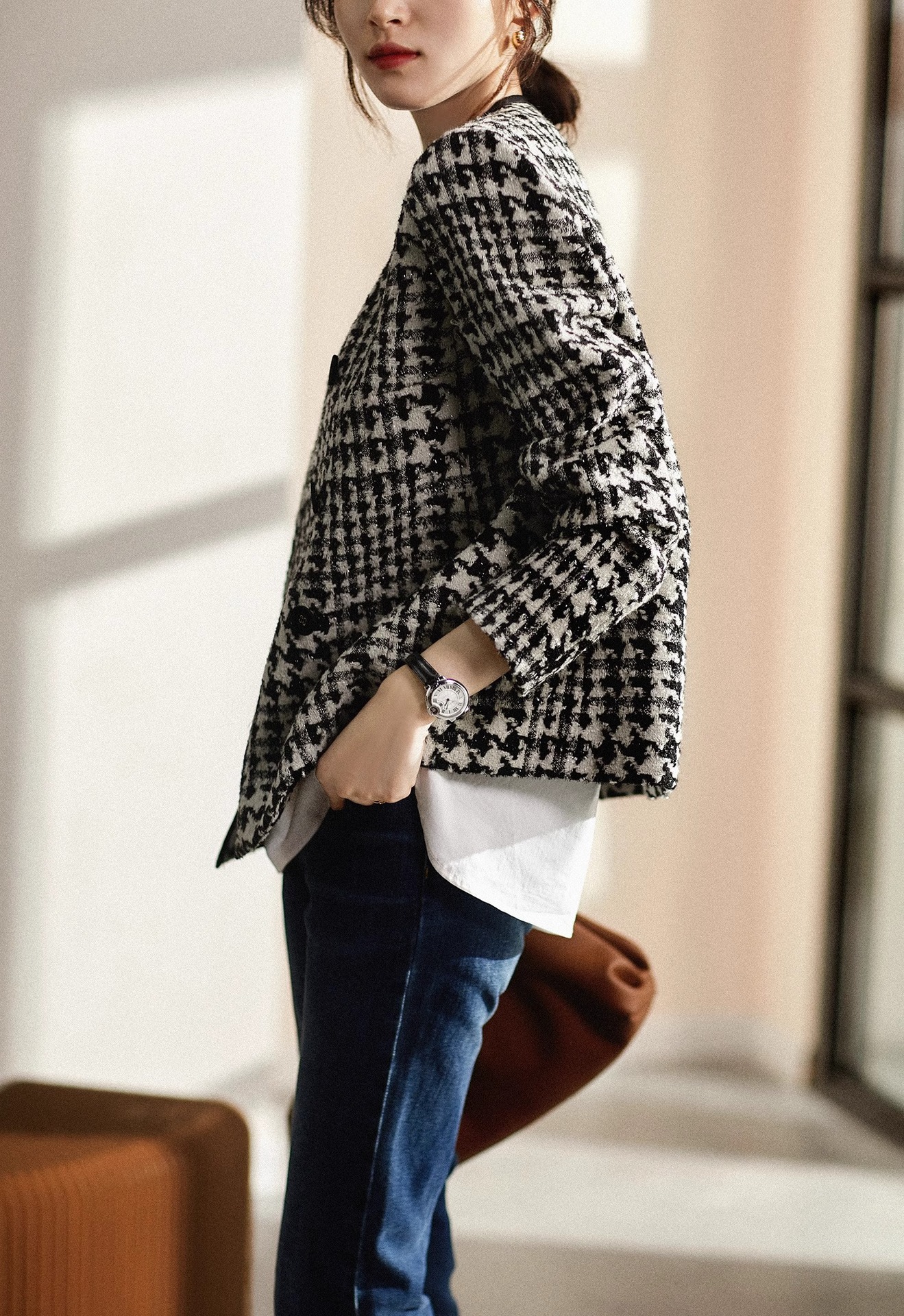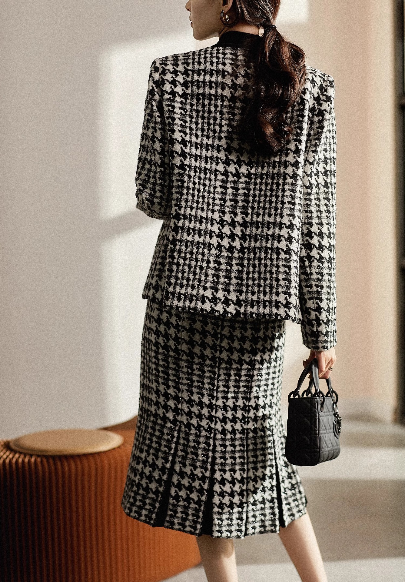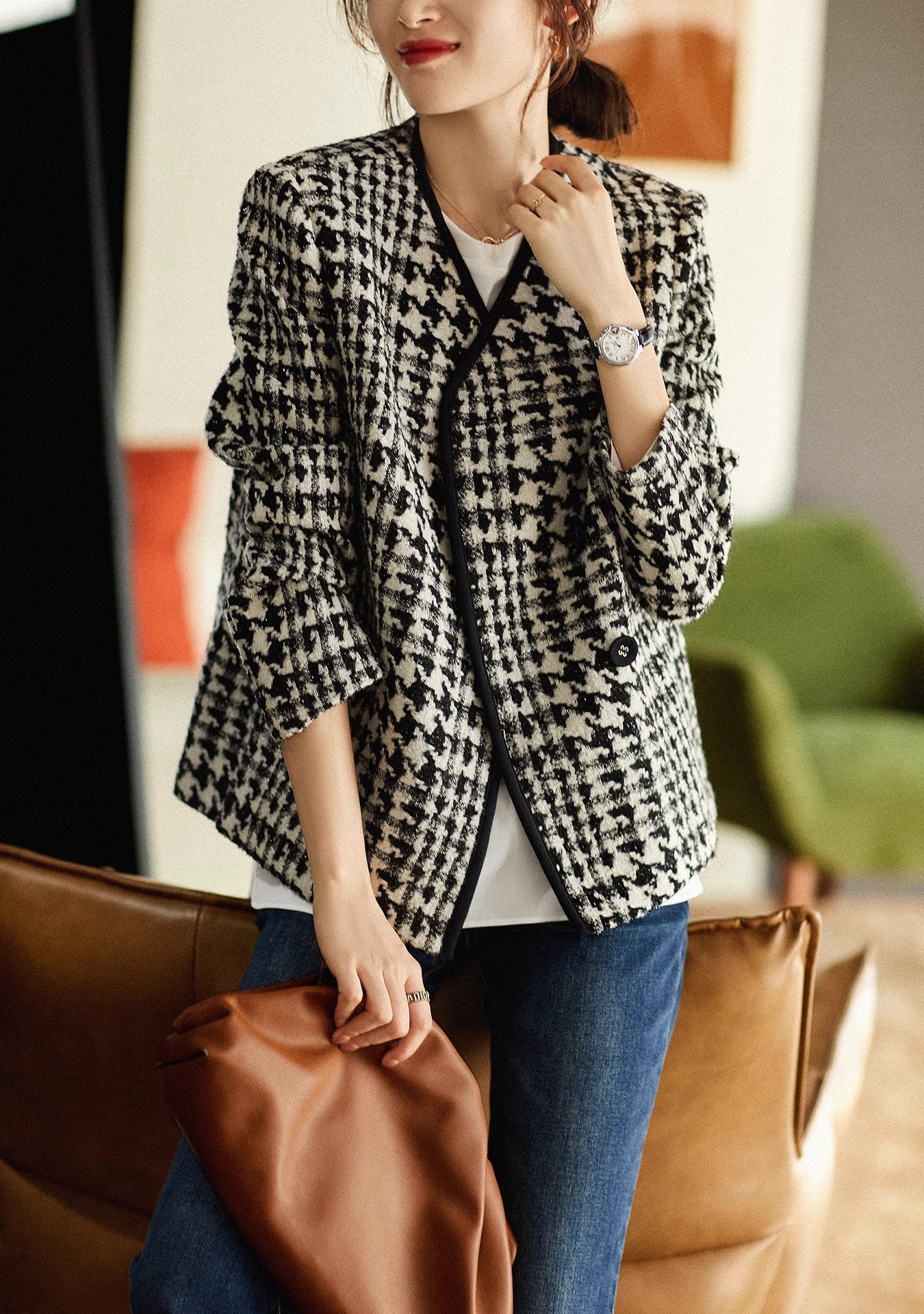 设计感秋冬香凋女神无压力系列匠心花呢千鸟格绵羊毛小香风外套女