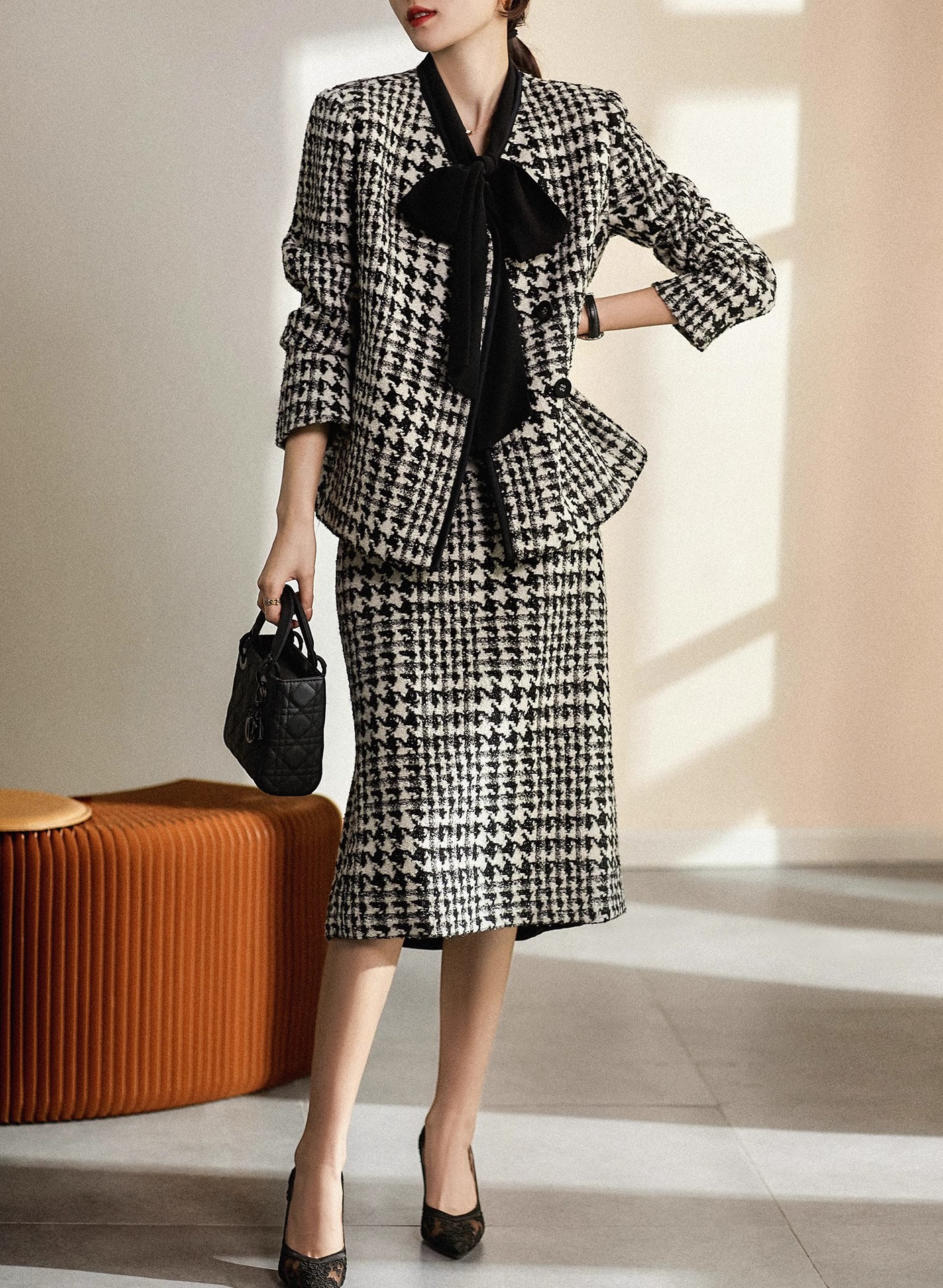 千鳥格小香風セット2024冬の爆発的な気質の蝶結びの格子のコートの半身のスカートの2つのセット