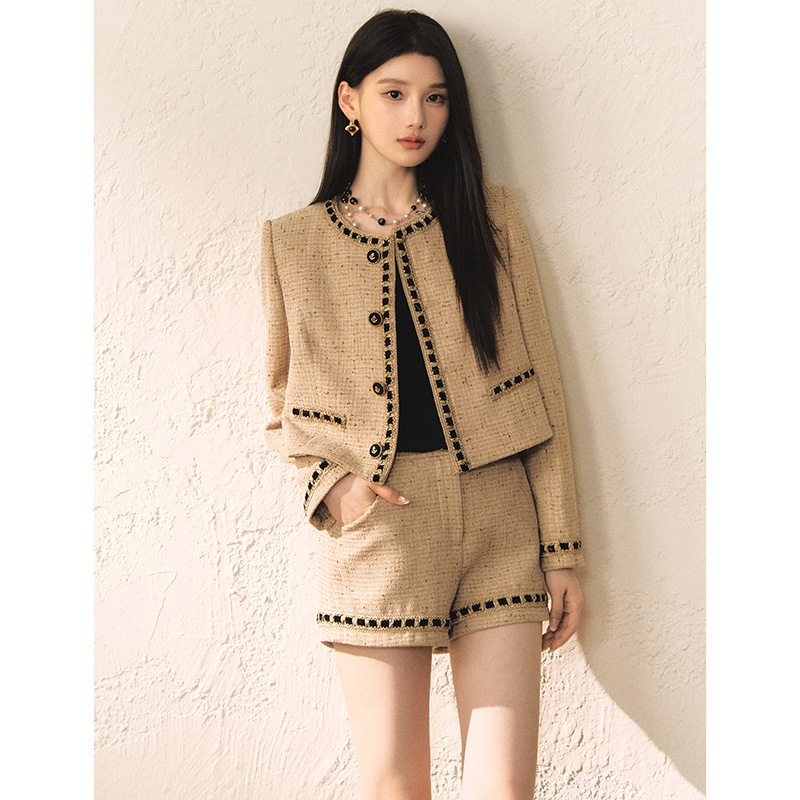 秋季小香风粗花呢短款小西装套装2025新款高级感显白时尚花边套装