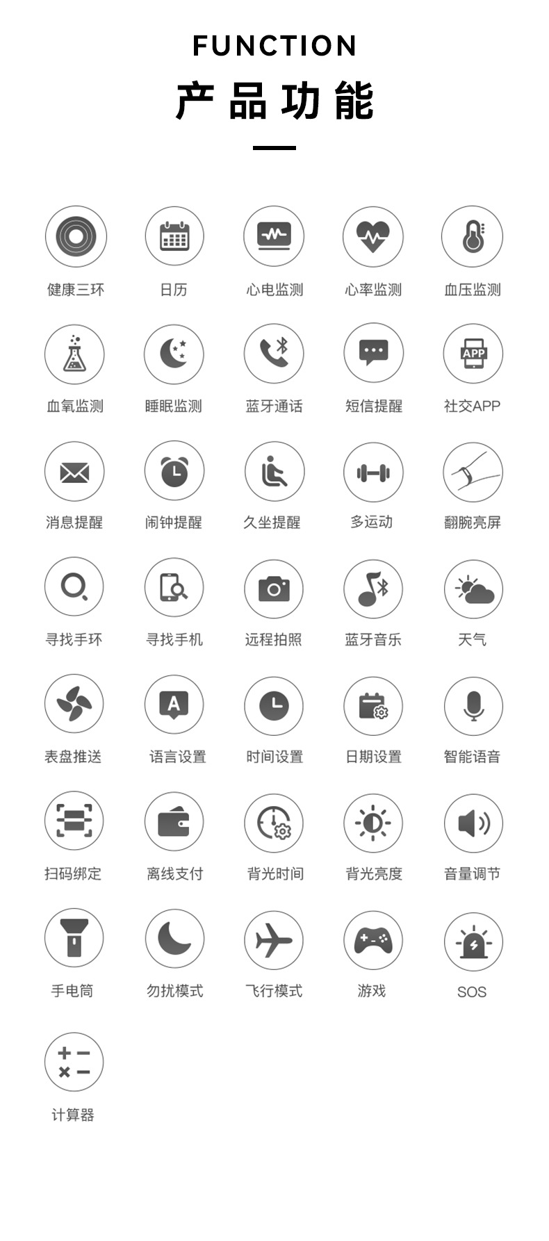 機能 写真を撮る,歩数カウント,心拍数モニタリング,血圧測定,Bluetooth通話,スマートリマインダー,睡眠モニタリング,血中酸素検査