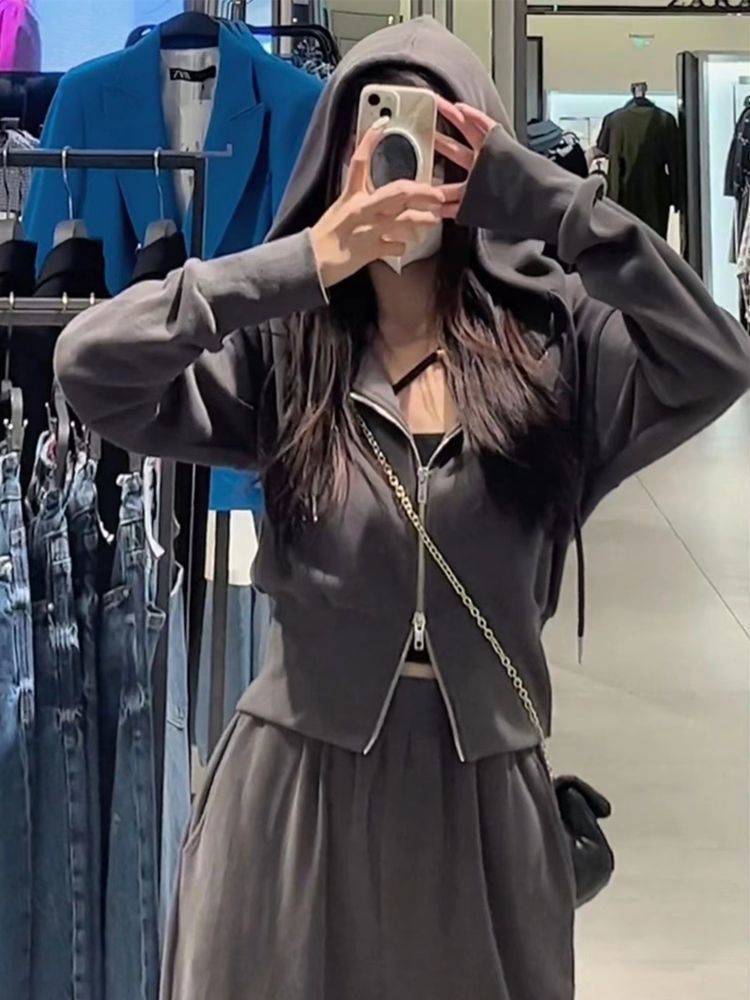2024春秋新作韓国版ゆるいフード付きの大きいサイズの女性のセクシーな首掛けのワンピース2点セットのファッション