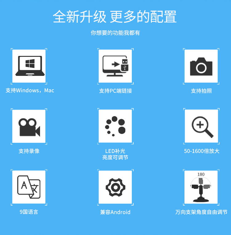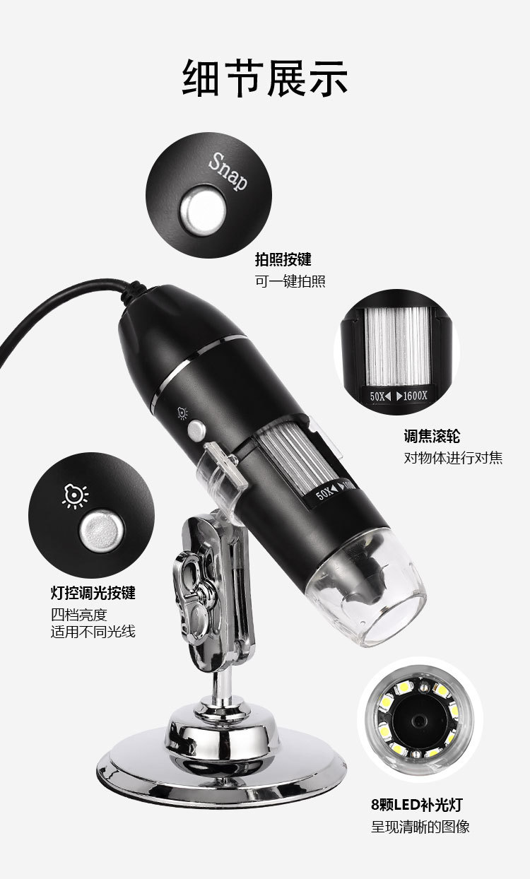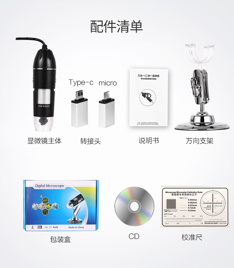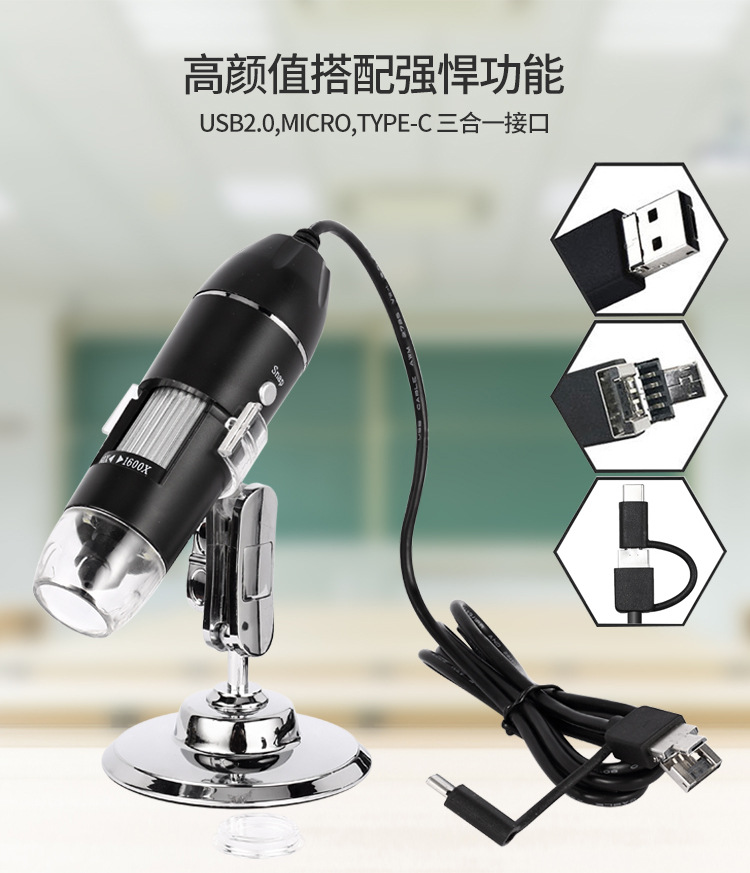 三合一显微镜1600x数码电子显微镜type-c 安卓 USB电脑顯微鏡相機