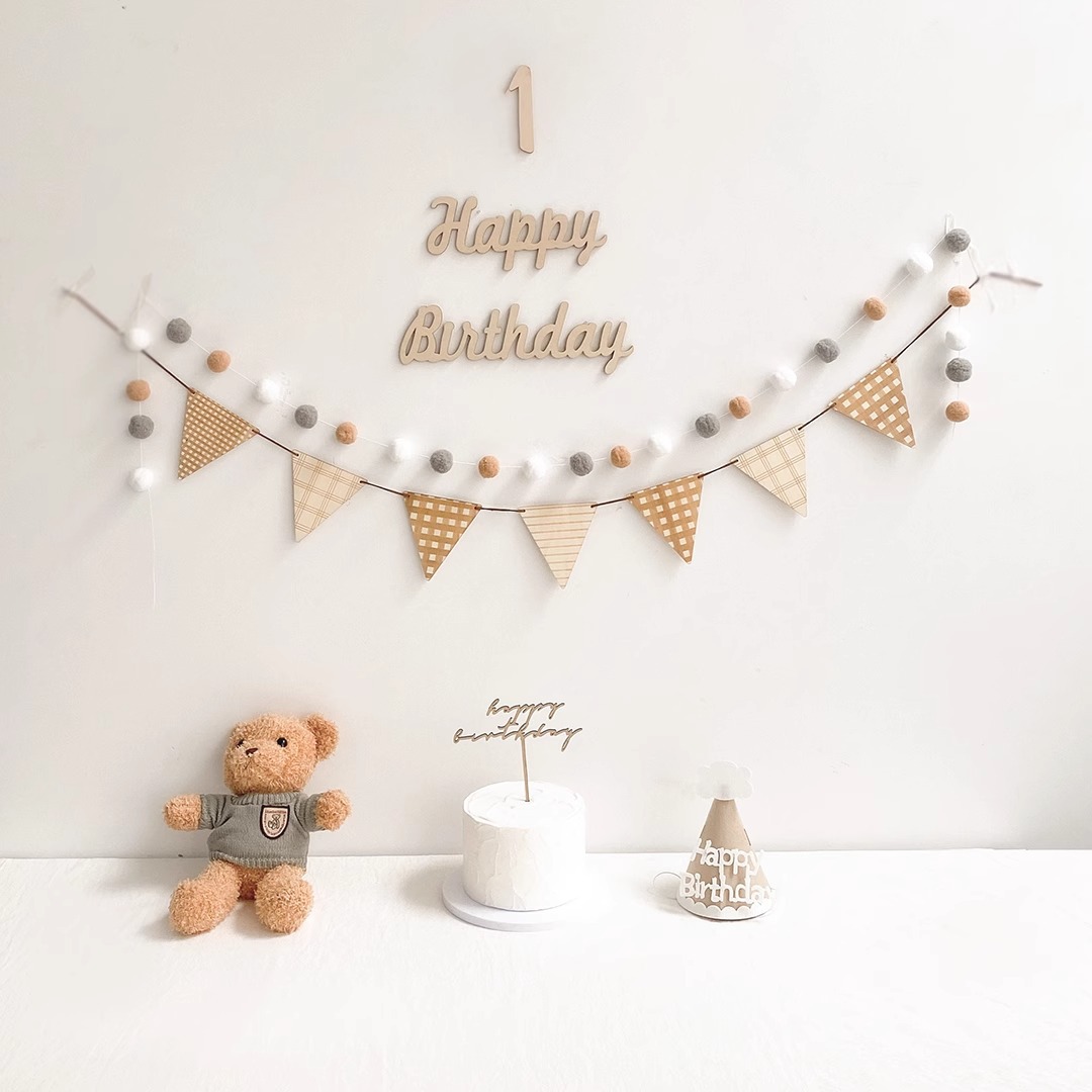 Ins風森系木質三角拉旗赤ちゃん満歳誕生日満月配置毛玉串パーティー装飾用品
