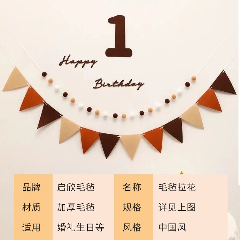 Ins風森系フェルト三角拉旗誕生日満月赤ちゃん歳配置毛玉串パーティー装飾拉旗