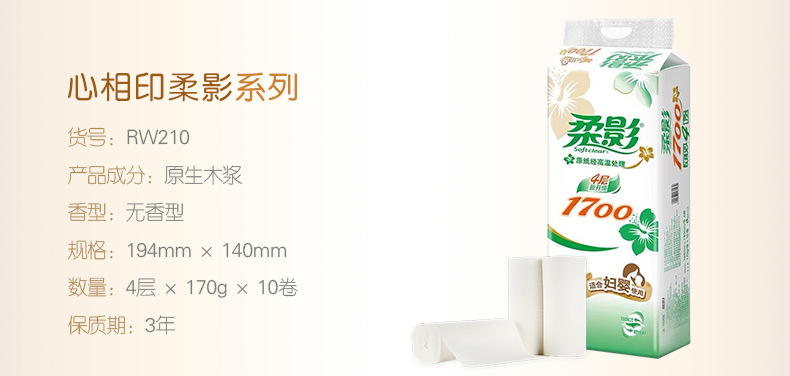 RW210心相印柔影170グラム10粒/提装四層無芯トイレットペーパー母子家庭用ロール紙トイレットペーパー
