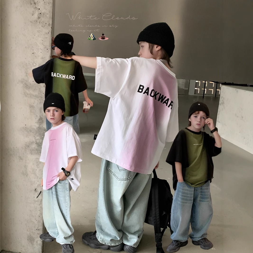 ネックラインに大きな文字が入った男の子用タイダイTシャツトレンディな半袖2025新しい子供服夏用半袖トップスTシャツ