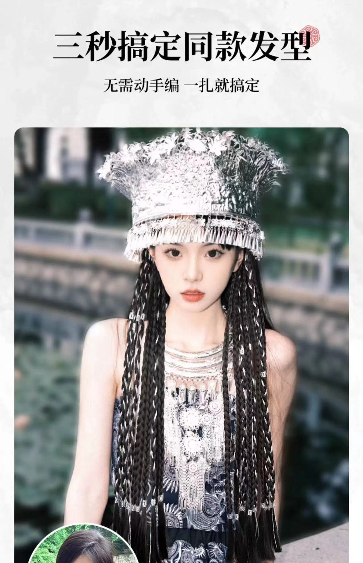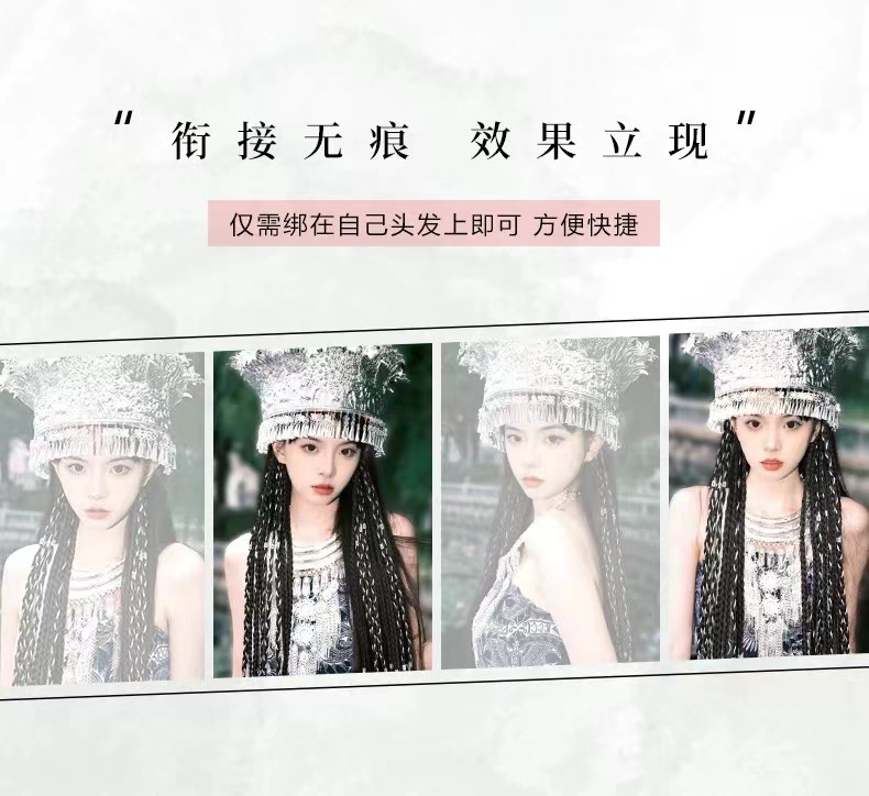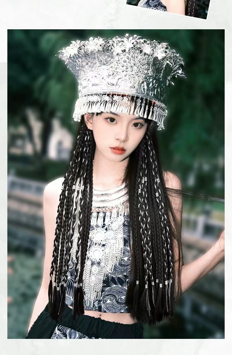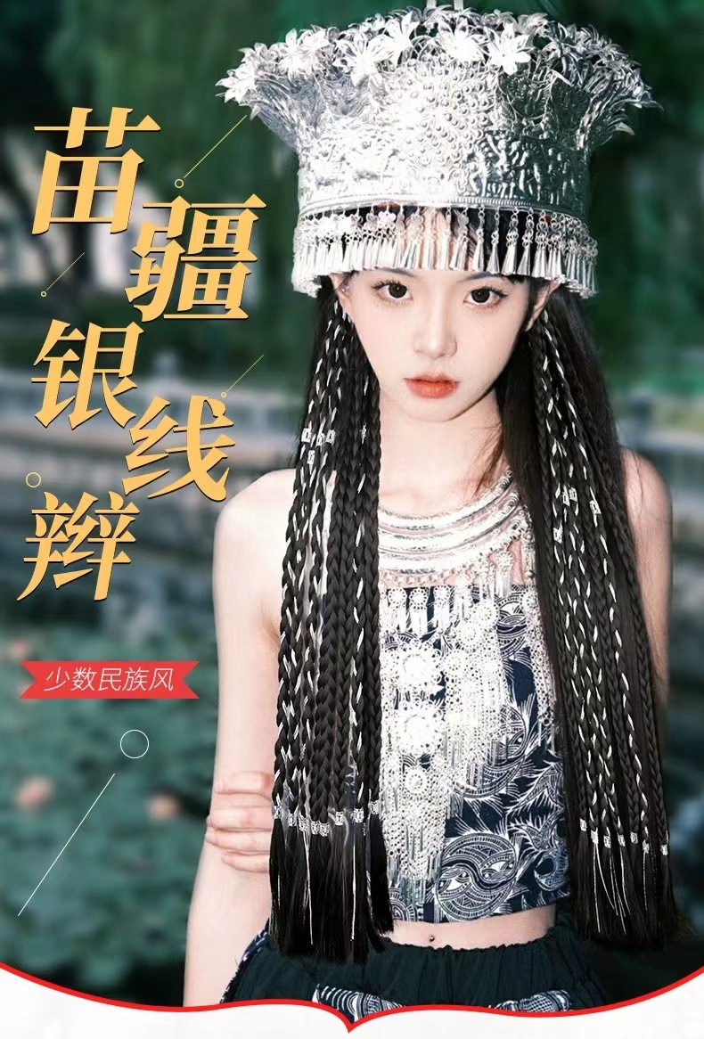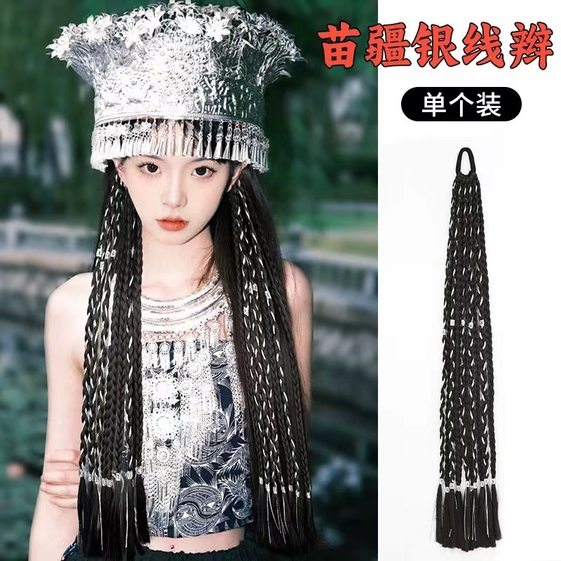 かつらのお下げの苗疆の少女の銀の糸の汚いお下げの古風のチベット式の双馬尾の銀の糸の麻の花の長いお下げの民族の写真
