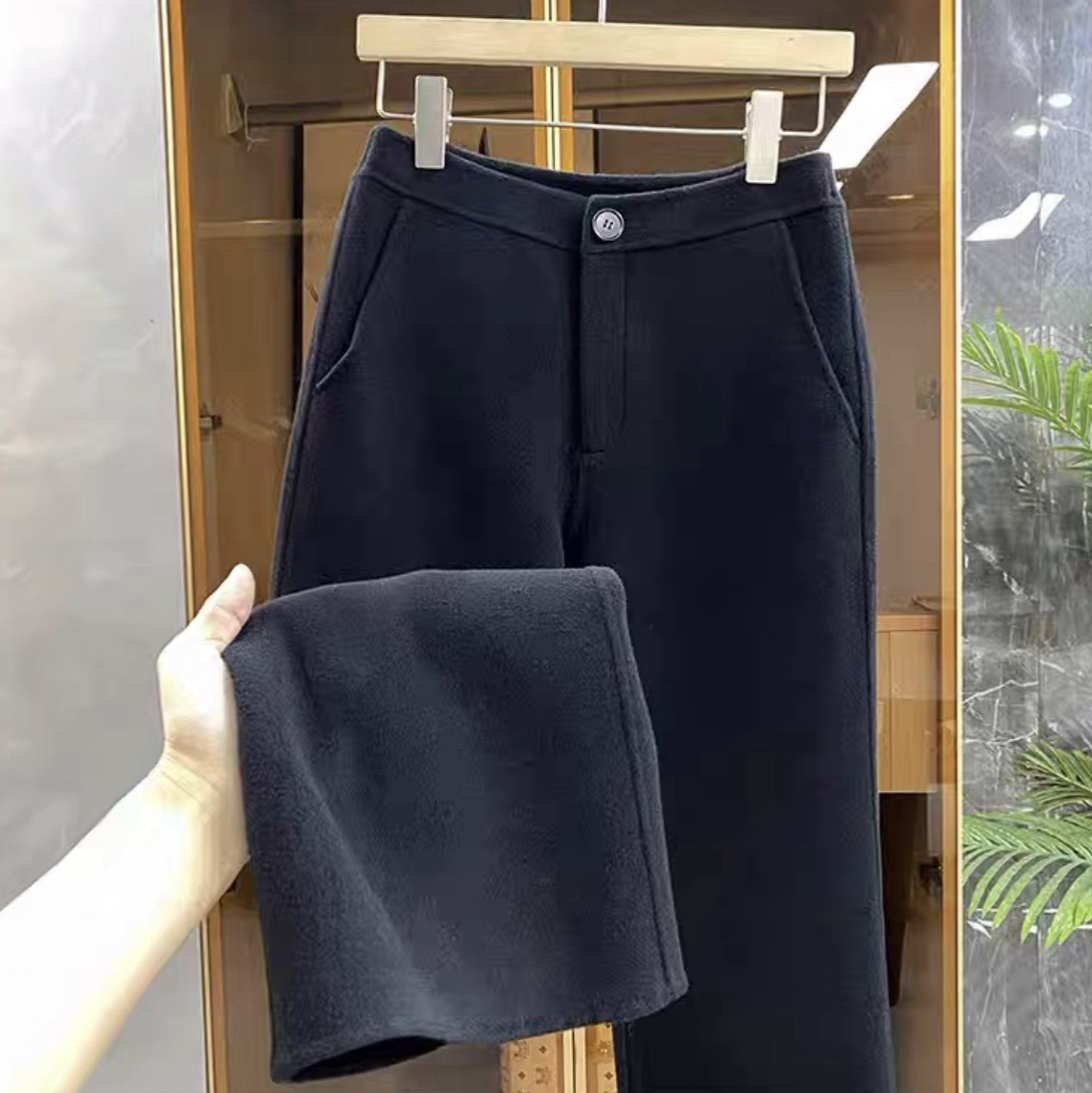 黒のベルベットの狭いバージョンのワイドパンツの女性の秋冬の垂直感が高くて、腰が細く見えます。