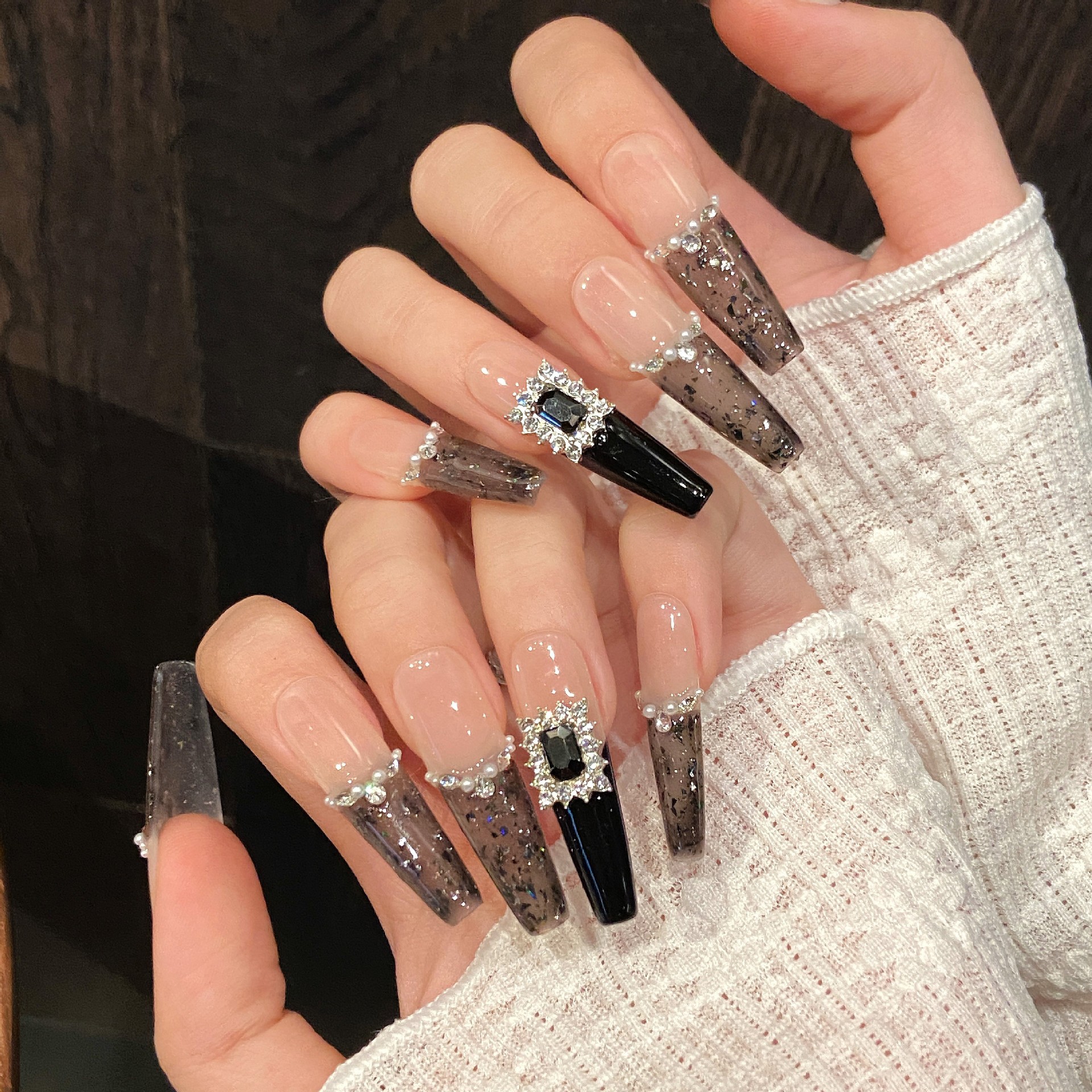 芸禾のネイルの黒色のフランスの真珠の精緻な小さい香の風は白い偽の爪の完成品の長いタイプの手作業で甲を着ます。