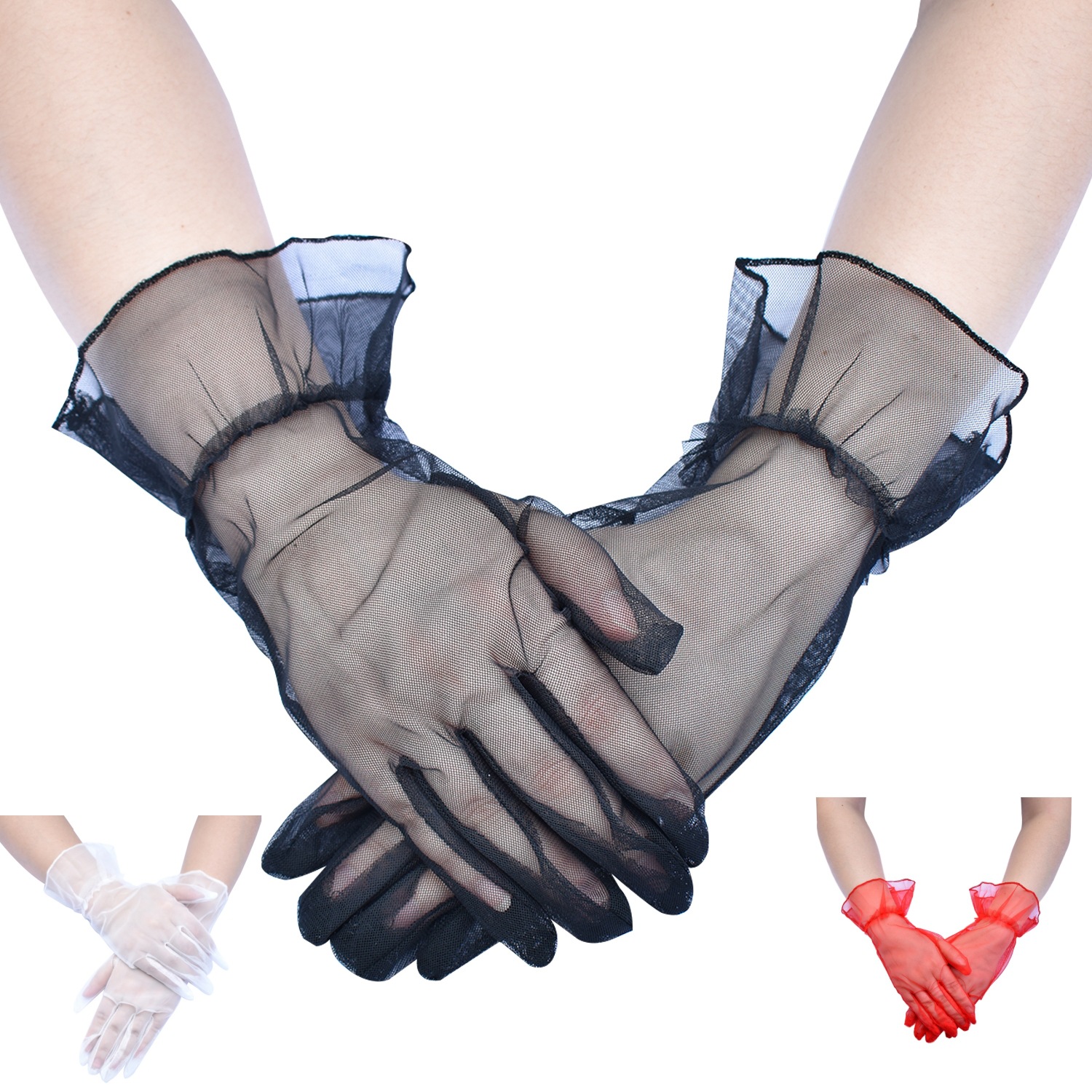 ウェディング手袋女性韓国式透明薄網糸ショートカラー白黒紅粉有包指春夏秋ドレス手袋