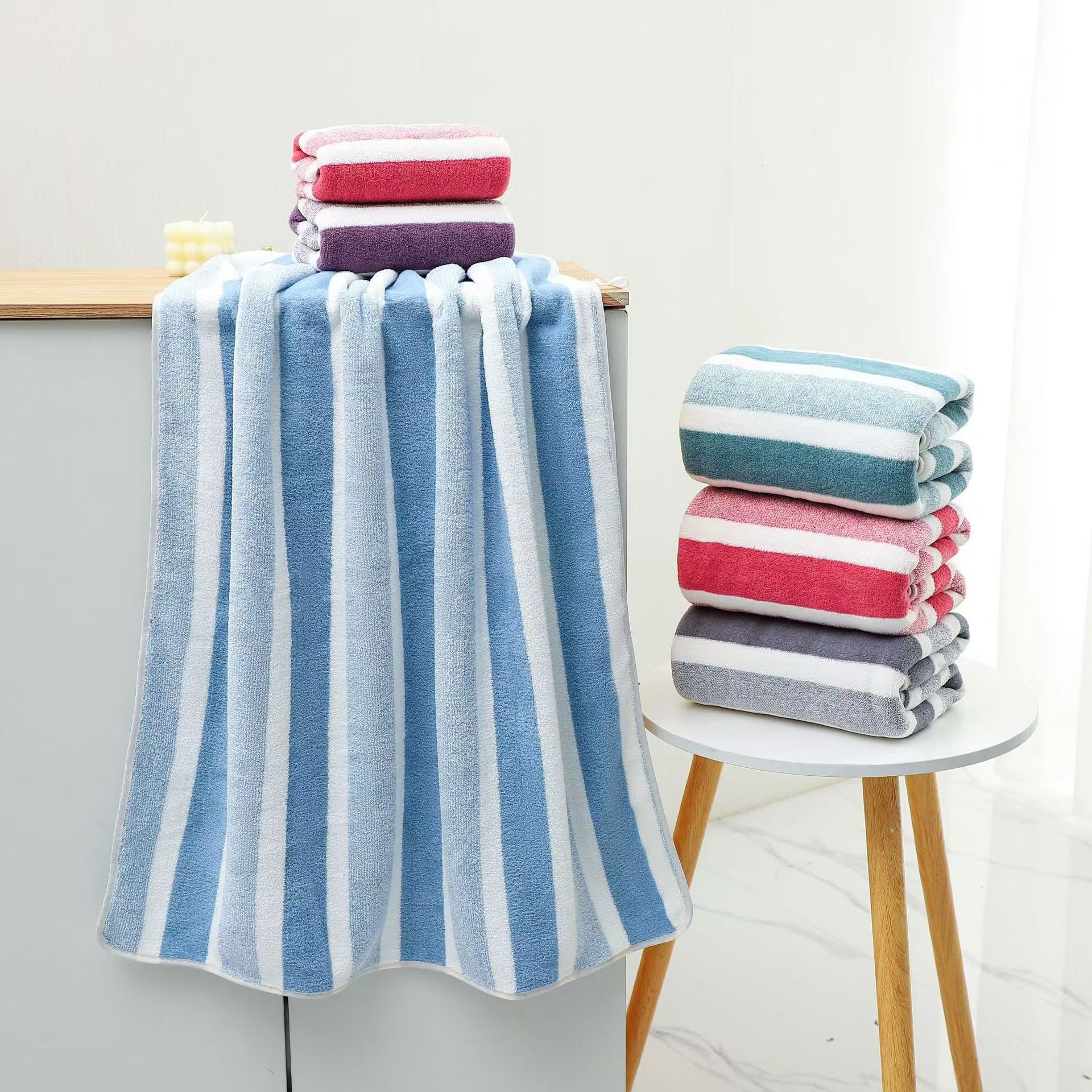 コーラルベルベットタオル、越境配送、経編バスローブセット、厚手吸水性、幅広カラーストライプ、柔らかい家庭用フェイスタオル