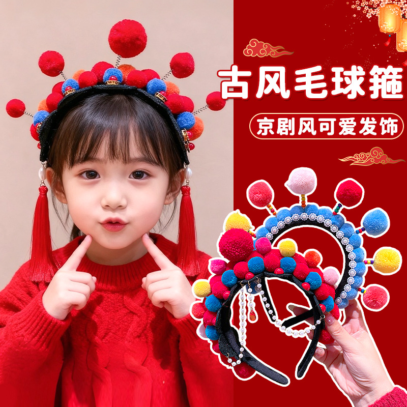 红色中国风毛球头饰京剧可爱古风儿童发箍头箍毛绒毛球搞怪发卡女
